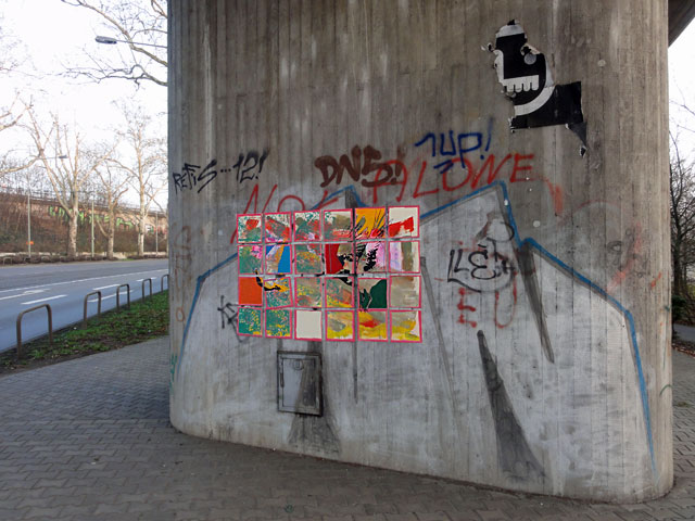 Fußgänger sind dort seltender anzutreffen, allenfalls sportlich aktive Menschen rund um den dortigen Park. Schade eigentlich, denn dieses aus 24 dünnen Tafeln bestehende Werk ist mehr als einen flüchtigen Blick wert und zudem auch mal etwas anderes im Frankfurter Street Art-Allerlei.