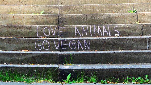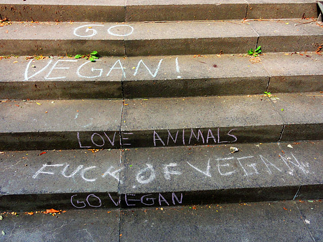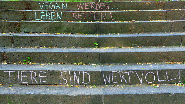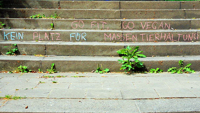Im Netz wurde es gestern fleißig diskutiert, „draußen“ habe ich nicht ansatzweise etwas davon mitbekommen: Die Rede ist vom „Veggie-Day“. Ein Thema, welches die BILD dieser Tage zum Thema machte und im Netz zu zahlreichen Diskussion führte. Quasi passend zu diesem Thema gibt es auch wieder neue Kreide-Aktivitäten aus Frankfurt zu vermelden, dieses Mal entlang der Treppen am Bornheimer Hang.