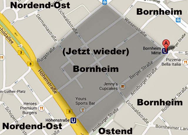 Die Grenze zwischen den Stadtteilen Bornheim und Nordend-Ost verläuft nun entlang der Höhenstraße und der Burgstraße, anstatt wie zuvor, entlang der Wiesenstraße. Anders formuliert: Der mittlere Abschnitt der Berger Straße, mit dem Gebäude wo früher der Saturn drin war, der St. Josef Kirche und dem Berger Kino, und die Abschnitte der parallel dazu verlaufenden Heidestraße und Petterweilstraße, gehören nun wieder zu Bornheim.