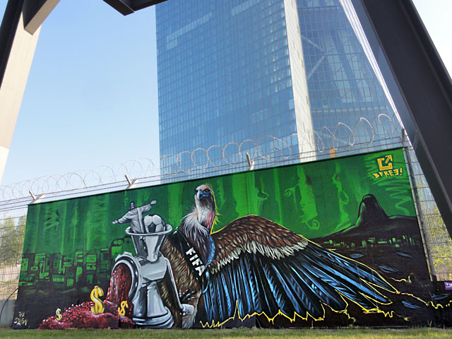 Die WM in Brasilien und die Machenschaften der Organisation mit Sepp Blatter an der Spitze sind aktuell auch Gegenstand bei einer der vielen Graffiti-Malereien entlang der neu entstehenden EZB-Zentrale in Frankfurt. Das hier zu sehende Werk ist von B-FREE, der mit seiner Kreativ-Agentur artmos4 u.a. auch die Living Walls-Projekte in Offenbach veranstaltet.