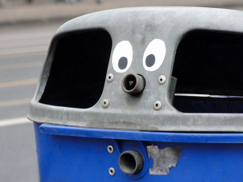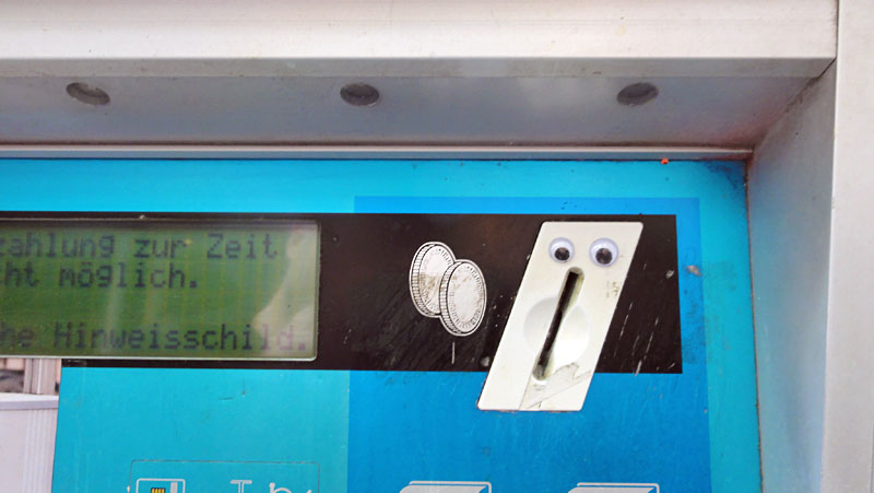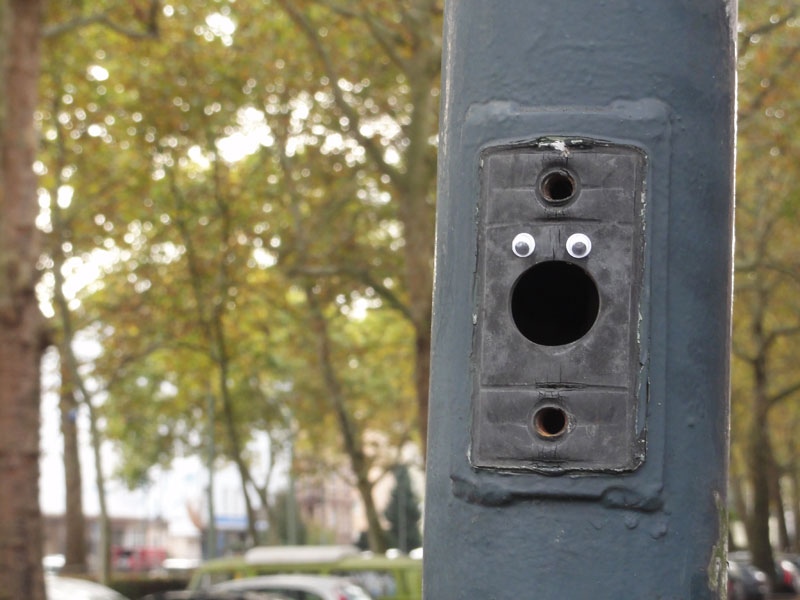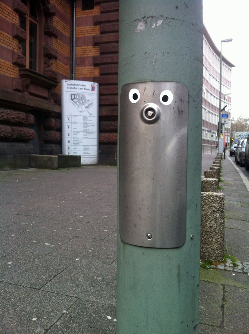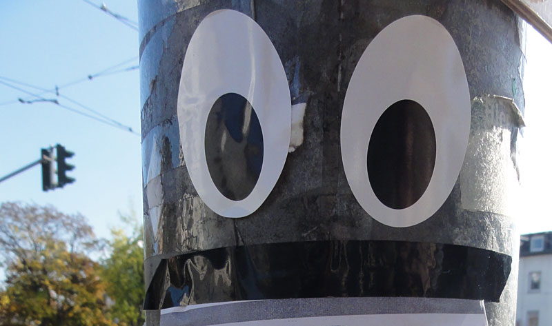 In jedem Schreibwarengeschäft oder 1€-Laden gibt es einen Ständer mit Aufkleberests, z.B. mit Glitzerkätzchen, Blümchen oder: Augen. Große Augen, kleine Augen, Wackelaugen. Darüber hinaus findet man das eine oder andere Paar Augen auch in freier Wildbahn, an Verkehrsschildern, Ampeln oder Straßenbeleuchtungen, die im Zusammenspiel mit Elementen des Trägers, z.B. den Schlitz für den Münzeinwurf, ein Gesicht ergeben.