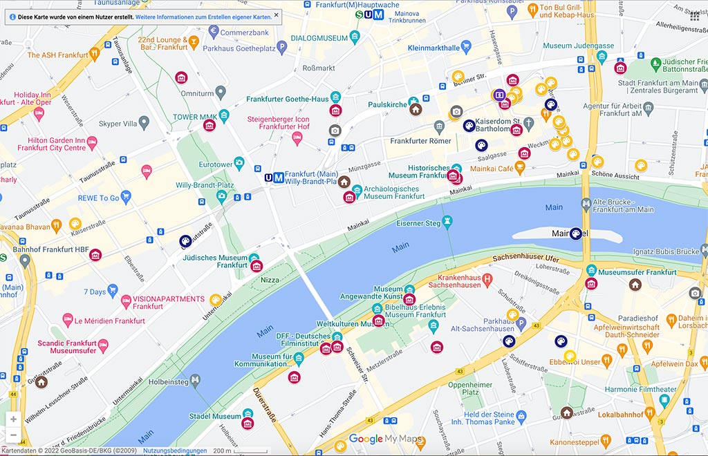 Ich habe mit dem Kartendienst Google Maps eine Übersicht zu Ausstellungsorten in Frankfurt am Main erstellt. Eingetragen sind u. a. Ateliers, Galerien, Kunstvereine und Museen.