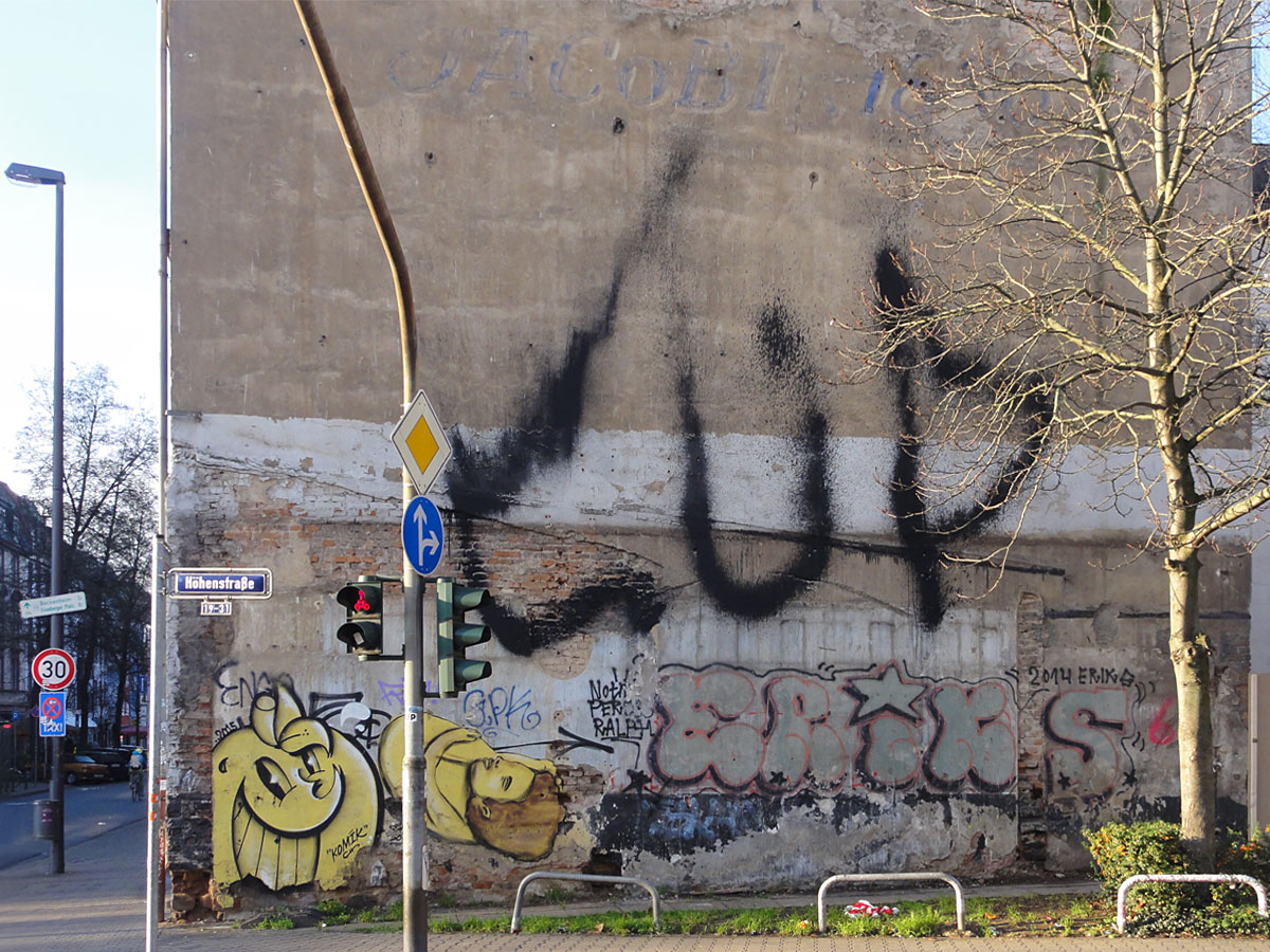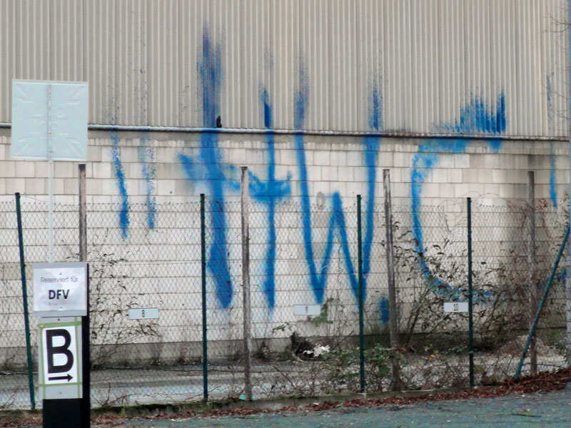 Wenn im öffentlichen Raum nicht mit Markern, Sprühdosen oder Malerrollen agiert wird, sondern Feuerlöscher, Hochdruck-Spritzpistolen u. ä. zum Schreibutensil umfunktioniert werden, ist in der Regel nicht mit typografischen Finessen zu rechnen, dafür aber immer mit unübersehbar großformatigen Resultaten. Anbei einige Fotos zu diesem Thema aus dem Frankfurter Stadtgebiet.