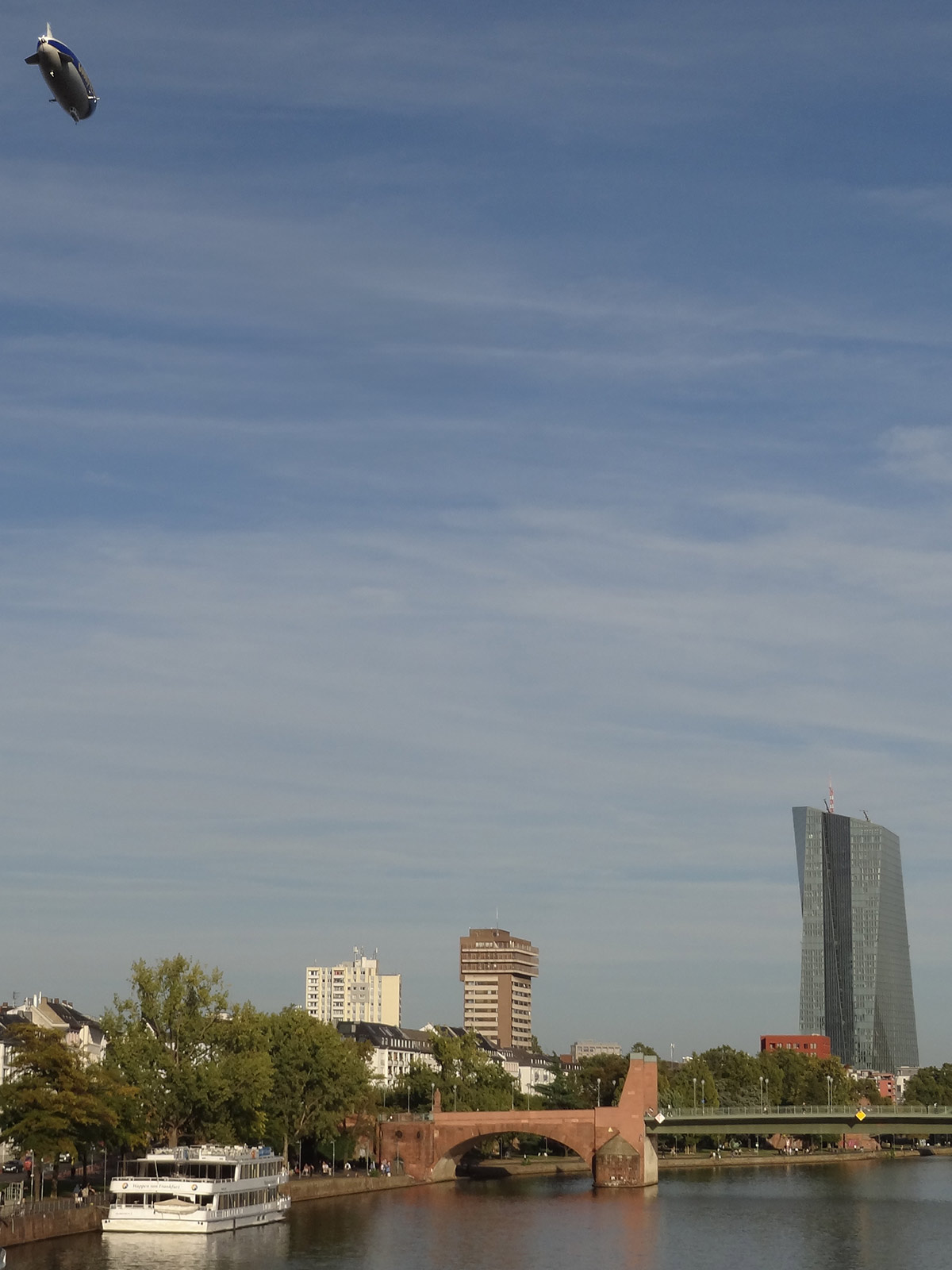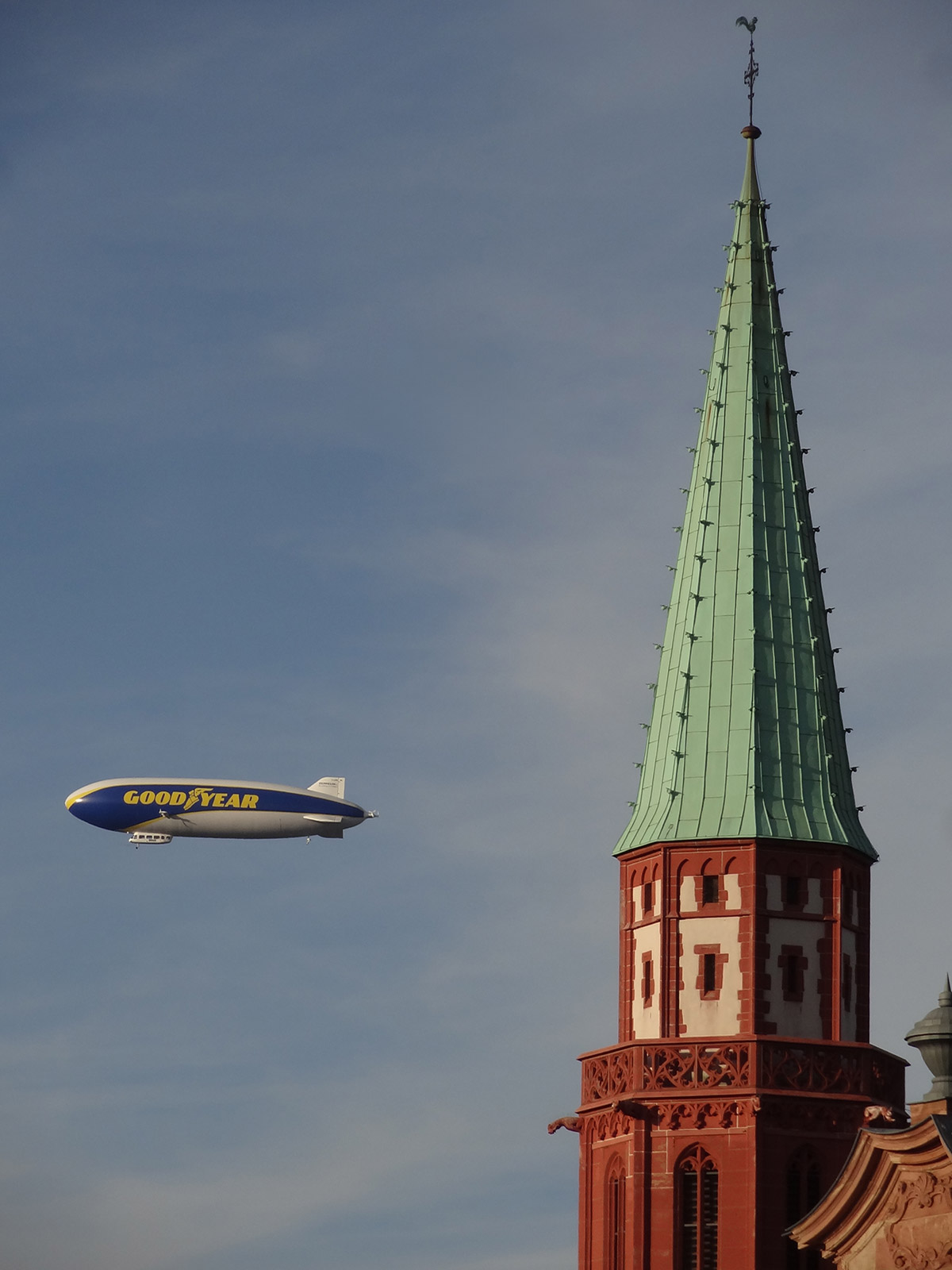 Der Goodyear-Zeppelin dreht auch am heutigen Montag seine Runden über Frankfurt. Im Gegensatz zu den vorherigen Aufnahmen von Samstag, ist der Himmel diesmal klar und der Zeppelin nicht (immer) ganz so weit entfernt.