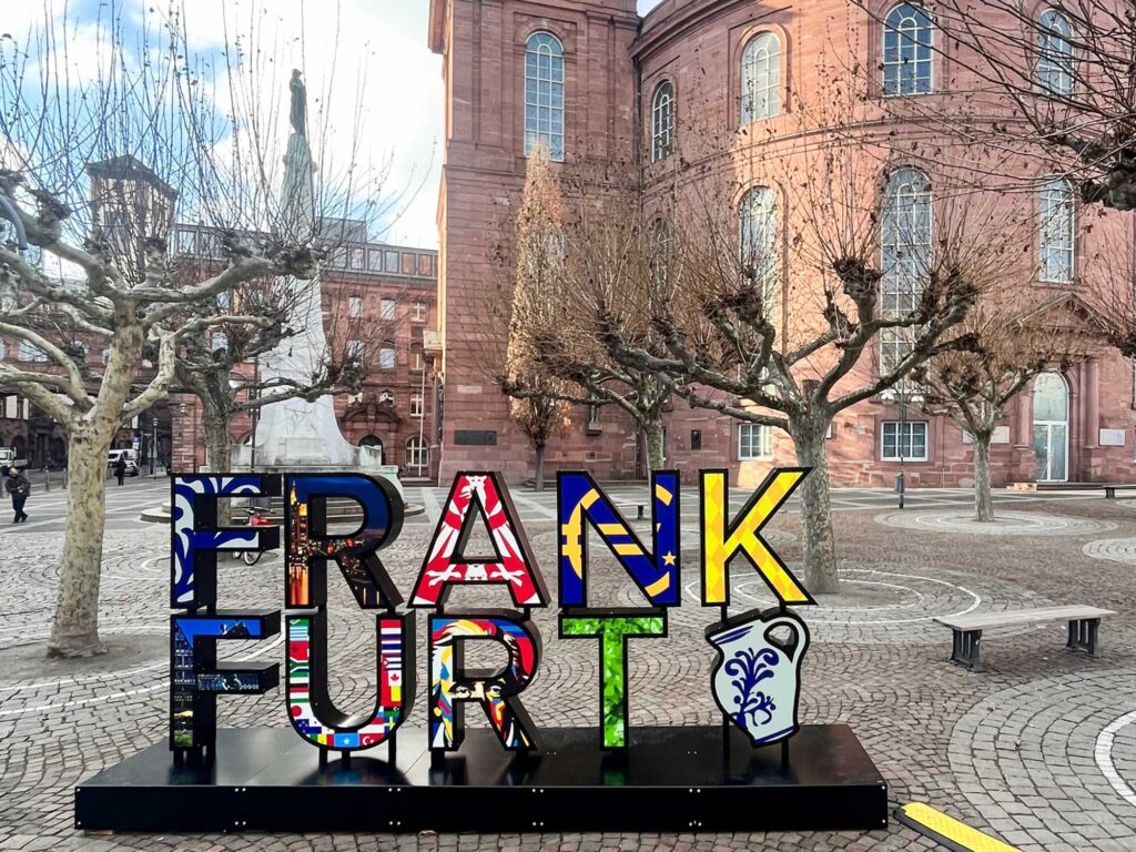 Nach dem Vorbild des bekannten Hollywood-Schriftzugs in Los Angeles wurde 2016 auf dem Feldherrnhügel an der Ecke Marktplatz/Berliner Straße in Offenbach die Typo-Installation „Offenbach Hills“ aufgestellt. Aufgrund größerer Abbrucharbeiten an dieser Stelle verschwand dieser 2020 zunächst wieder, wurde aber Ende 2023 an neuer Stelle entlang der Berliner Straße wiedererrichtet. Nun hat Frankfurt am Main auch etwas in dieser Art, jedoch ohne sich von Hollywood inspiriert haben zu lassen – offenbar aber auch von niemandem und nichts sonst, so uninspiriert wirkt dieser Entwurf auf mich. Die Typo-Installation, die auf ein Projekt von Frankfurter Stadtmarketing und Dachverband der Frankfurter Gewerbevereine zurückgeht, wurde kürzlich auf dem Paulsplatz in der Altstadt aufgestellt und soll künftig auch an anderen Orten sichtbar sein, um als „Selfie-Point“ zu fungieren.