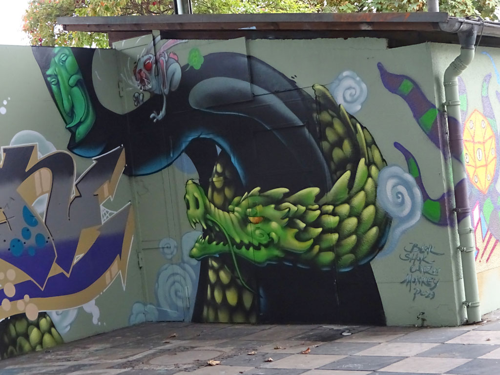 Da die Character Jam beim Jugendhaus und Mädchentreff am Bügel in den letzten Jahren eigentlich immer im Mai oder Juni veranstaltet wurde, hatte ich in diesem Jahr bereits einmal auf gut Glück dort vorbeigeschaut. Allerdings hatte ich nicht den Eindruck gewonnen, dass die Veranstaltung bereits stattgefunden hatte. Wie ich vor Kurzem mitbekommen habe, ist das Event diesmal erst am 14. und 15. September über die Bühne gegangen. Hier einige aktuelle Fotos von dort, vermutlich auch mit Werken, die nicht erst anlässlich der Character Jam entstanden sind.