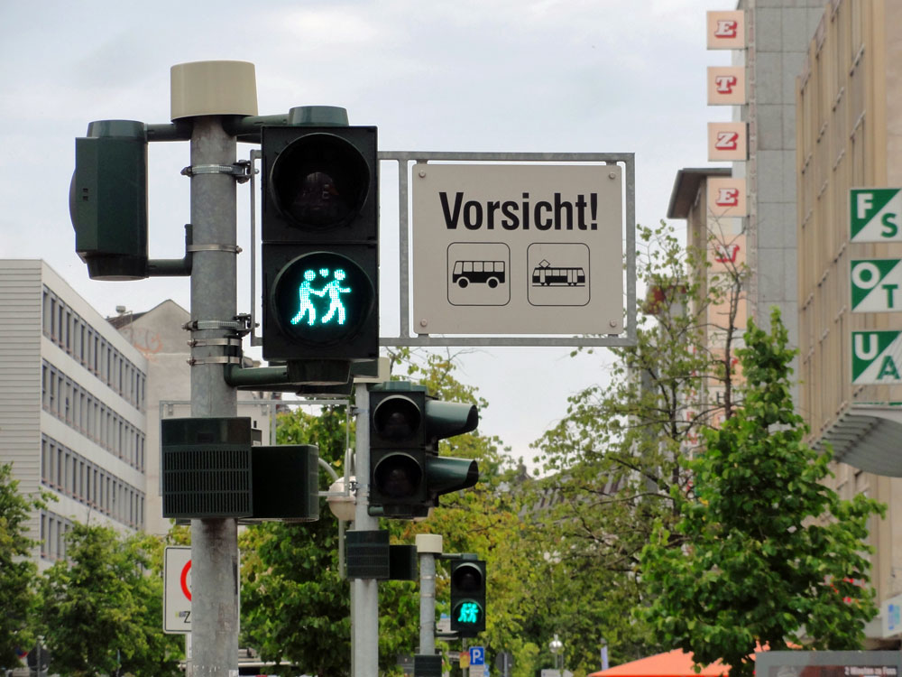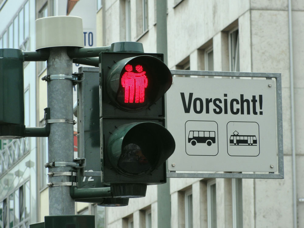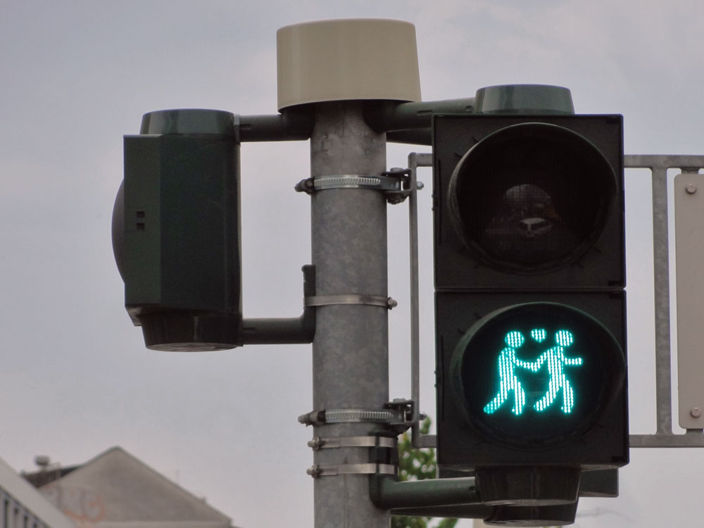 Anlässlich des an diesem Wochenende stattfindenden CSD in Frankfurt, sind die Anzeigen bei einigen Fußgänger*innenampeln an der Kreuzung Zeil und Konstablerwache modifiziert worden. Diese zeigen in den Rot- und Grünphasen nun gleichgeschlechtliche Pärchen an und sollen auch über die Zeit des CSD hinaus so bleiben.