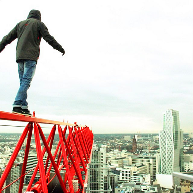Warum machst Du das eigentlich? Du verschaffst Dir ja nicht nur Zugang zu einem Dach, um z.B. von dort oben Fotos zu machen, sondern begibst Dich auf Kräne und Dachränder, zum Teil freihändig, ohne Halt und Sicherung.