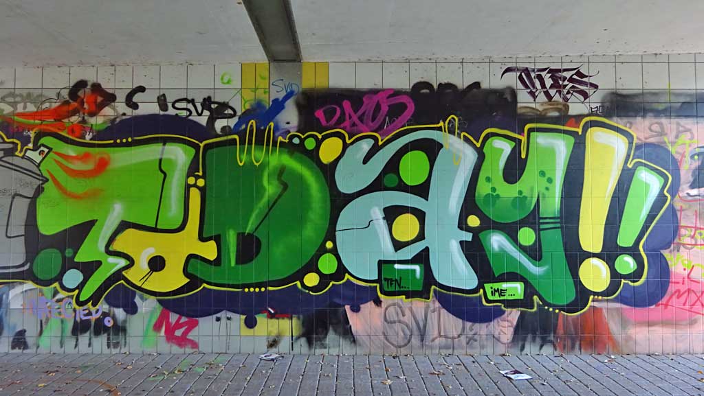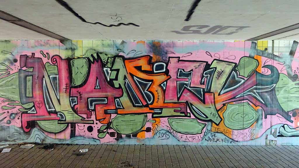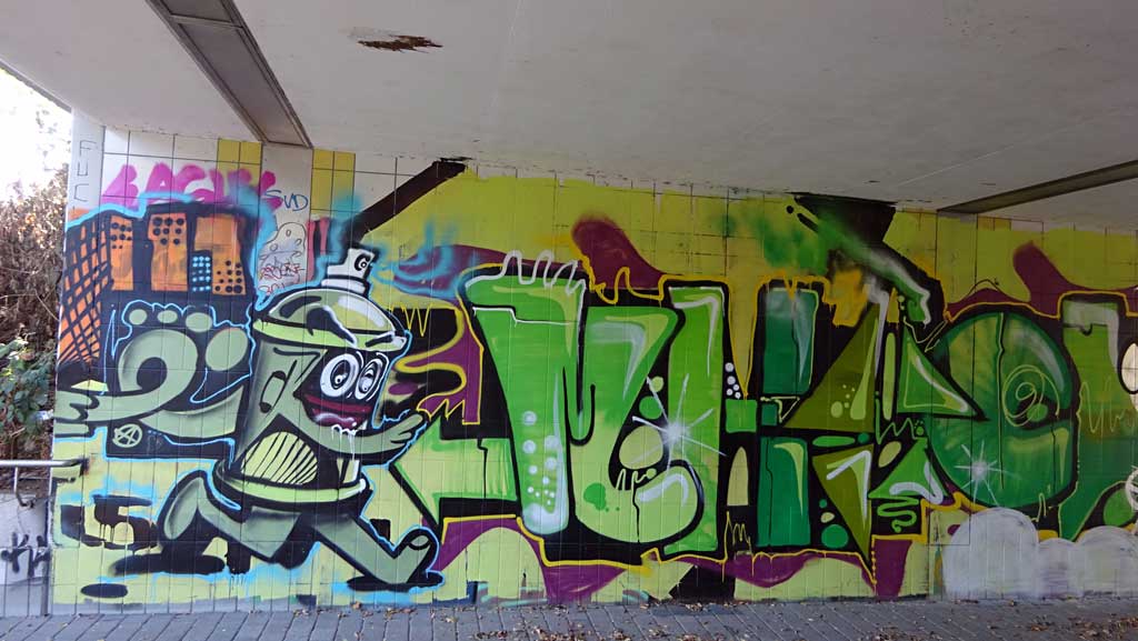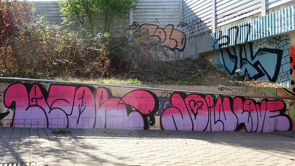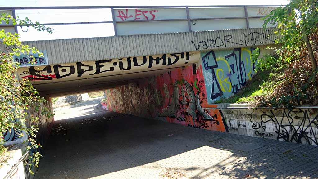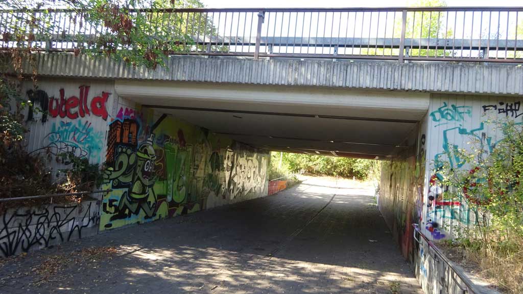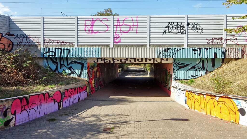 Nachdem vor rund zwei Jahren die erste Möglichkeit dieser Art am Westrand der Lincolnsiedlung eingerichtet worden war, dort mit rund 2.600 Quadratmetern Wandfläche, verfügt nun auch der Norden Darmstadts über eine legale Graffiti-Fläche. Dabei handelt es sich um zwei Unterführungen, die sich unweit der S-Bahn-Haltestelle „Darmstadt-Arheilgen“ befinden und von dort aus in nur wenigen Minuten zu Fuß erreichbar sind. Aktuell sieht es vor Ort wie folgt aus: