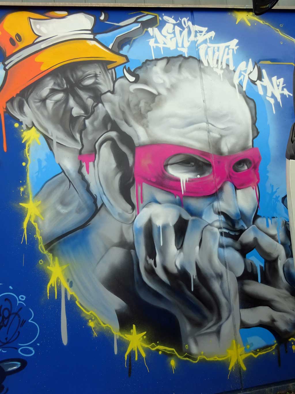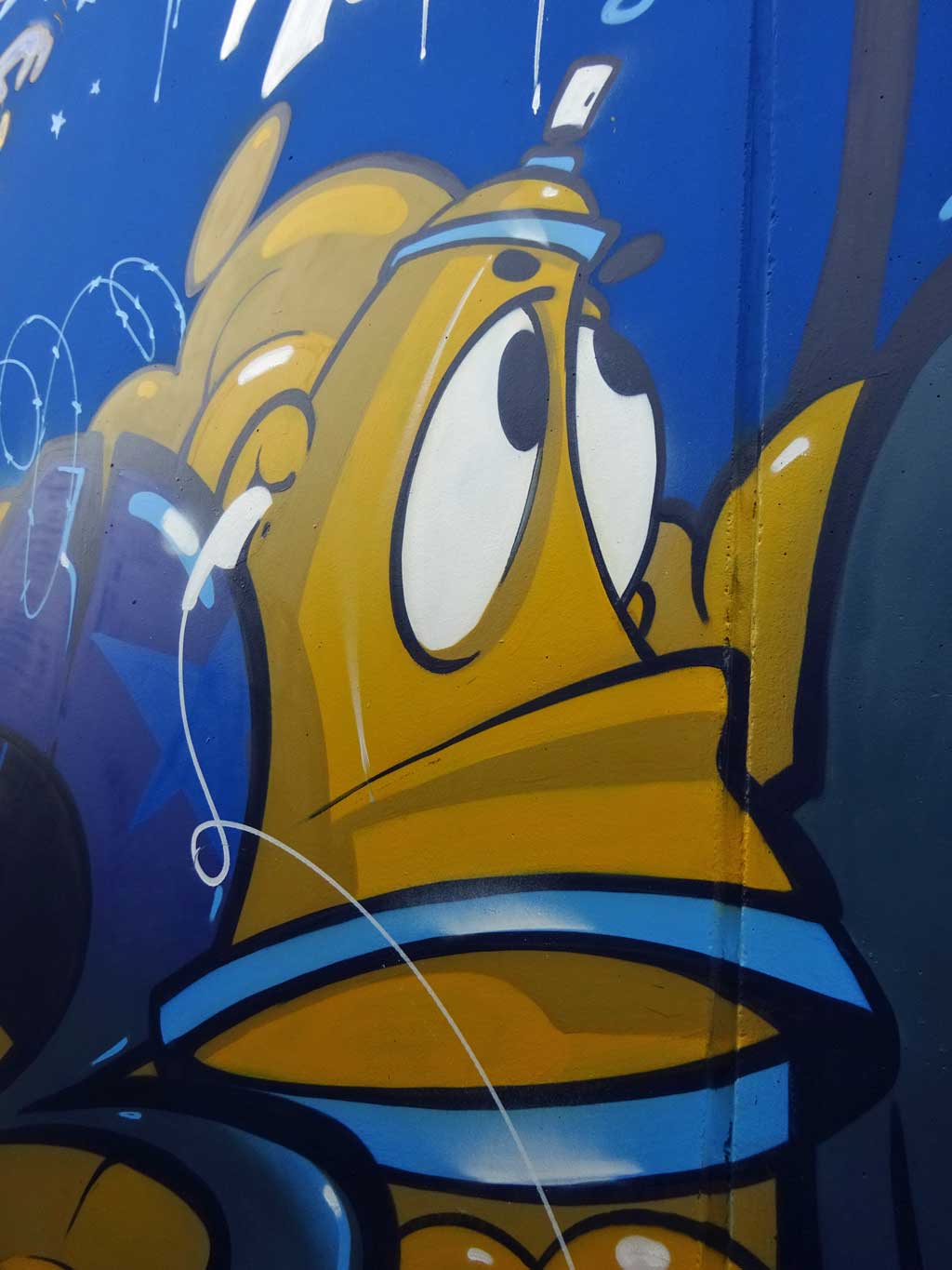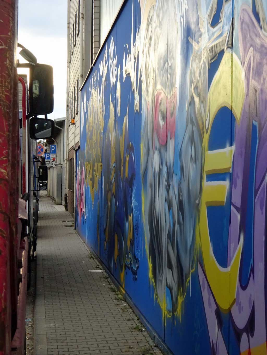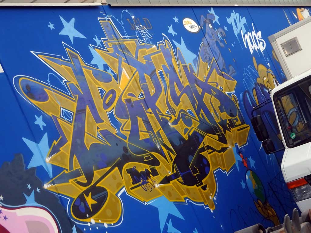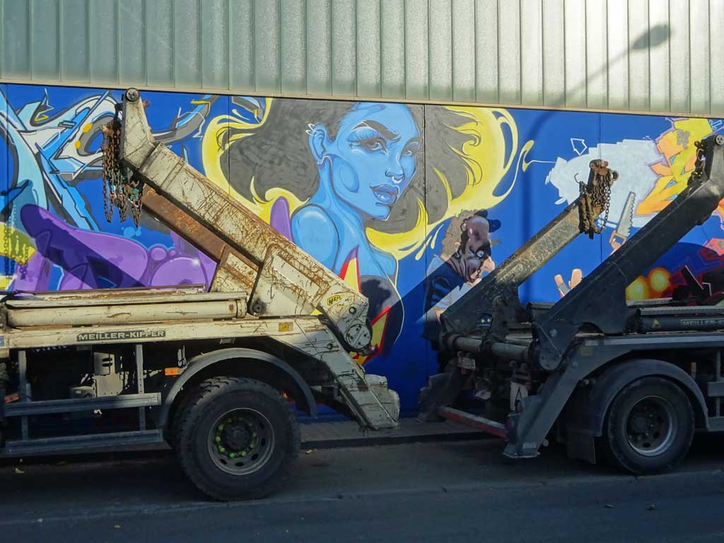 Wie bereits gestern in Streetart-Fotografie schwer gemacht beschrieben, scheint die Fläche leider regelmäßig mit Fahrezeugen zugestellt zu sein scheint, von daher gibt es an dieser Stelle nur Fotos, die Ausschnitte des Geamtwerkes zeigen.