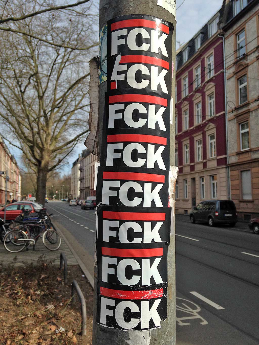 Im Jahr 2010 bin ich in Frankfurt innerhalb weniger Tage auf einige Abwandlungen des RUN-DMC-Logos aufmerksam geworden. Was zunächst vor allem als Aufkleber im öffentlichen Raum auftauchte, ließ sich später vereinzelt auch als T-Shirt entdecken. Irgendwann schien der Trend mit RUN vorbei zu sein, dann tauchten zunächst Don’t mess with […]-, und anschließend vermehrt FCK-Varianten auf. Auch hier galt: Roter Balken oben, roter Balken unten, in der Mitte ein weißer Text.