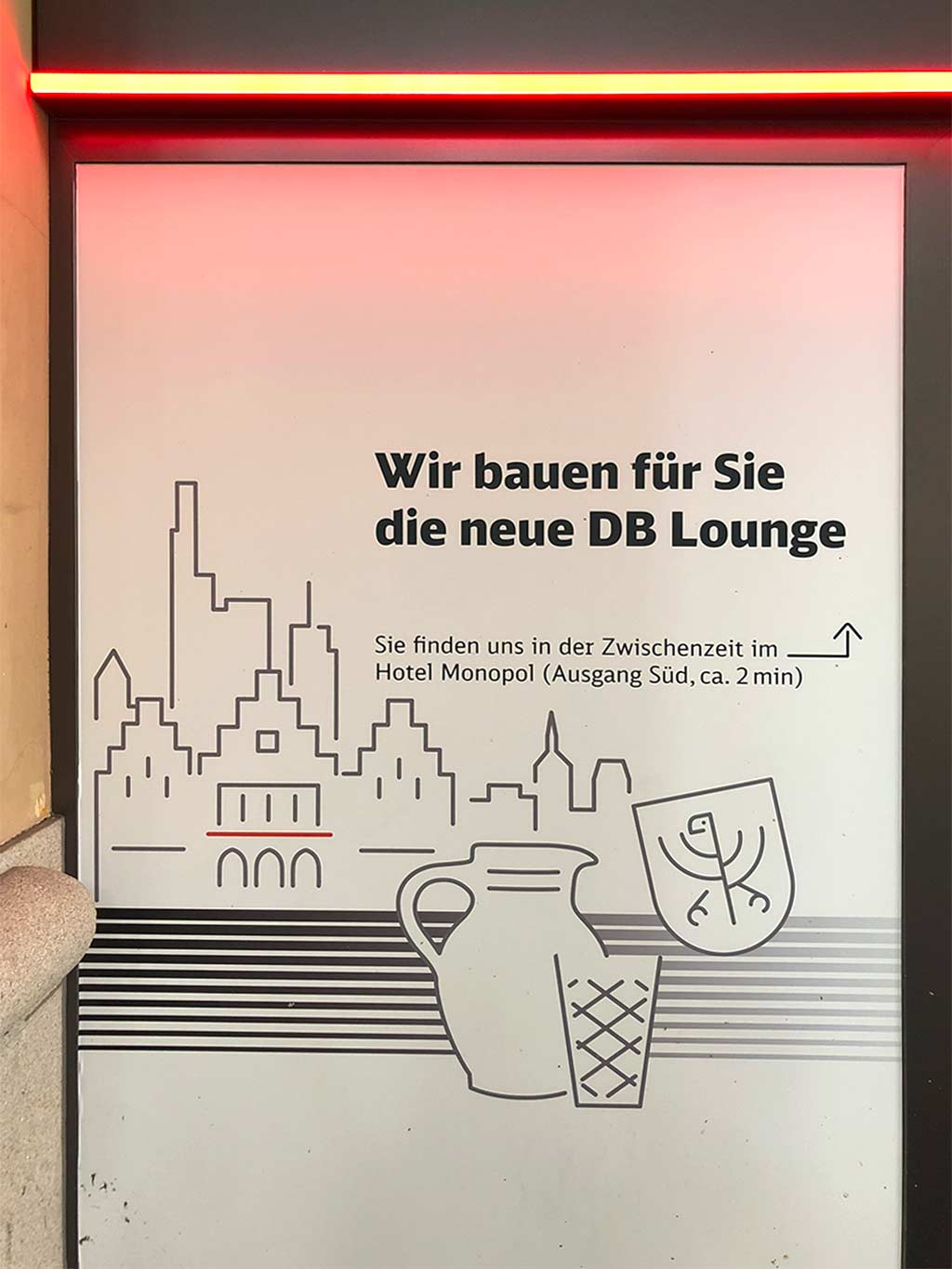 … und aktuell auch auf einer Hinweis-Tafel zur DB Lounge im Frankfurter Hauptbahnhof, zumindest eine Abwandlung davon. Auf der großen Digitaldisplayanzeige am Historischen Museum ist ebenfalls eine Darstellung zu sehen und ein weiteres Exemplar findet sich auf einem Schaufenster eines Fahrradgeschäftes in Nähe des Mainufers.