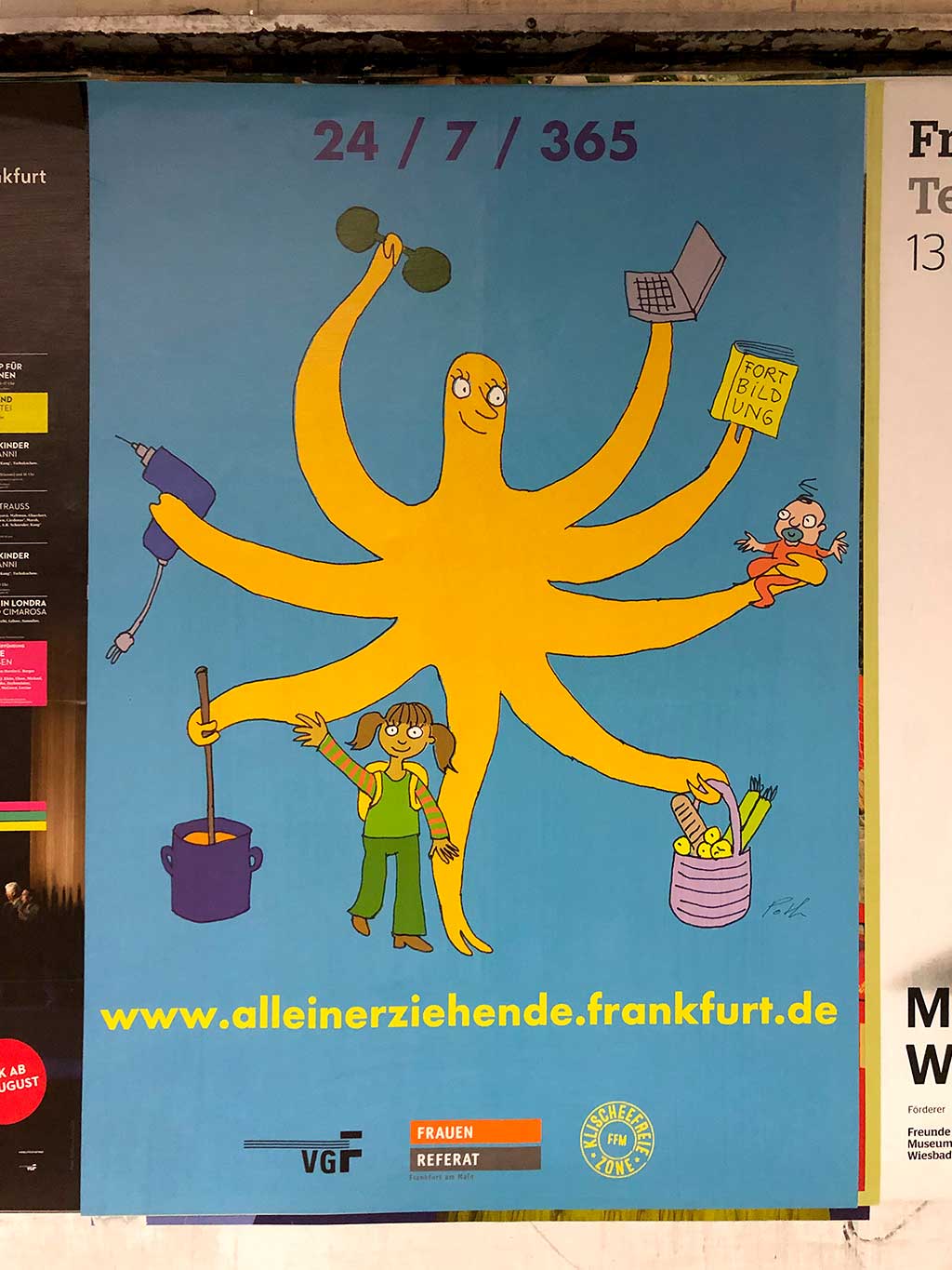 Da ich den von ihr gestalteten Kampagnen-Oktopus, der auf die vielfältigen Lebenslagen Alleinerziehender aufmerksam macht ganz sympathisch finde, gibt’s das Plakat und die drei Spots nun auch hier zu sehen.