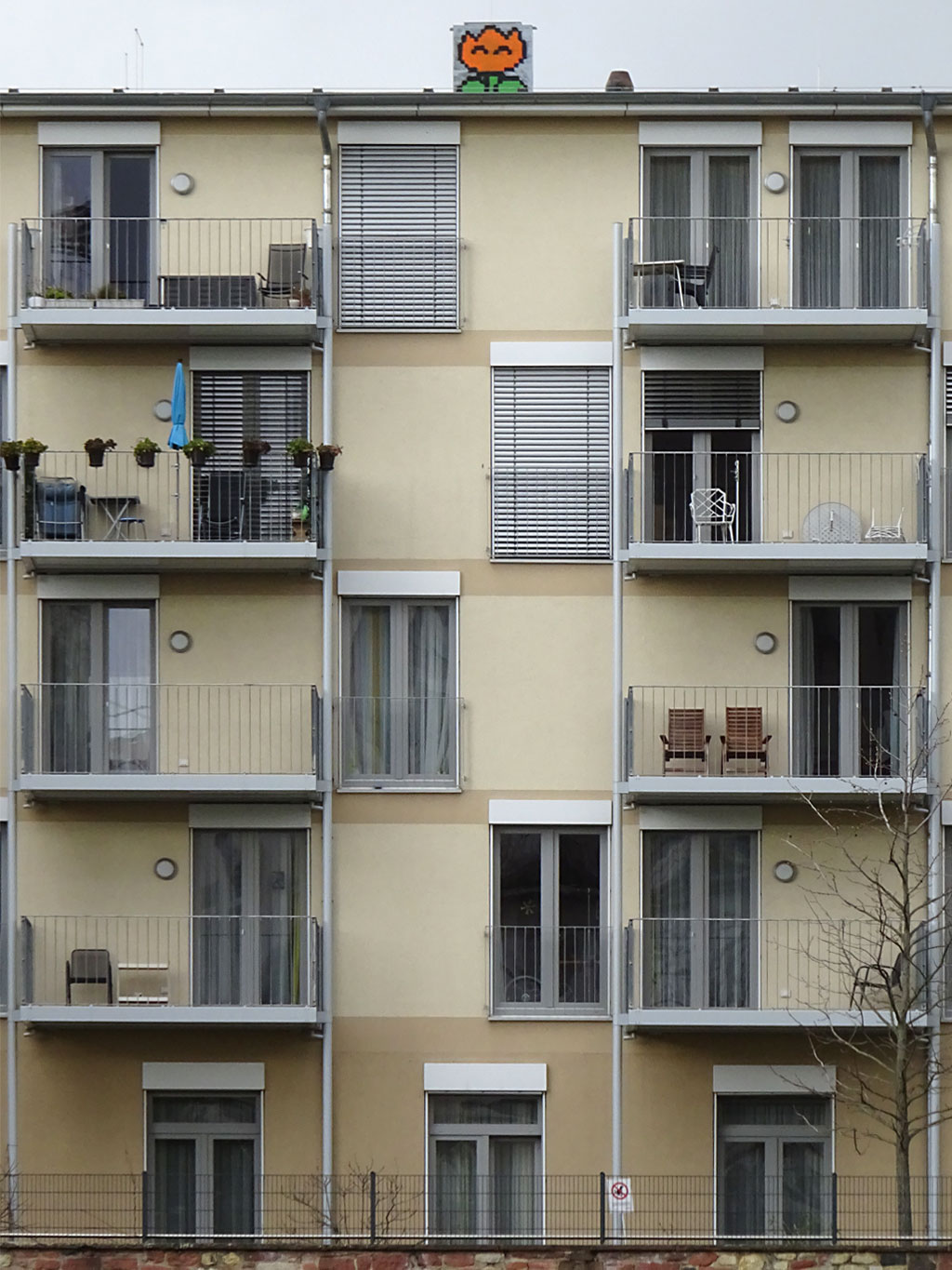 Die aus dem Nintendo-Universum bekannte Feuerblume taucht seit einigen Jahren in gesprühter Form im Frankfurter Stadtgebiet auf. Anfangs gab es sie auch auf Aufklebern und aus Bügelperlen, aber die gesprühte Variante, und hier besonders oft als Rooftop, scheint bevorzugt zu werden. Wer also auch mal den Blick nach oben richtet, sieht vielleicht auch welche. Es ist noch gar nicht so lange her, da hatte ich bemerkt, dass mindestens vier solcher Feuerblumen-Graffiti entfernt wurden. In den vergangenen Wochen habe ich aber wieder ein paar neue Exemplare gesichtet.