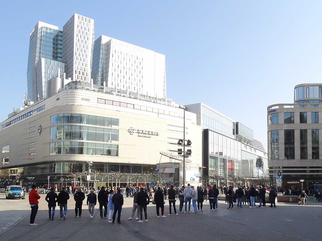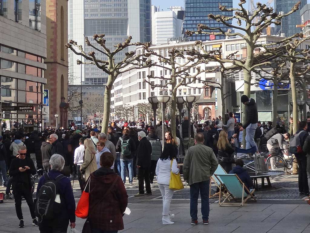 Als ich heute Morgen an die Hauptwache ging, um endlich ein vor einigen Wochen entdeckten Feuerblumen-Rooftop zu fotografieren, vernahm ich eine große Menschenmenge. Auf Anhieb war nicht zu erkennen, was sie dorthin geführt haben könnte. Keine Plakate, keine Schilder, keine Parolen, offenbar nichts Politisches. Sollte etwa schon der Startschuss gefallen sein für das Feiern an der Hauptwache statt auf dem Friedberger Platz? Also „Feiern“ im Sinne von „Ausgehen und dumm im Weg rumstehen“, wie z. B. an Samstagen die Weinschnösel entlang der Kleinmarkthalle, an der Ecke Berger Straße und Höhenstraße und an Markttagen in Bornheim Mitte? Nein, danach sah es nicht aus, aber auch nicht nach Konsumopfern, wie bereits vor einigen Jahren. Aber damit lag ich falsch.