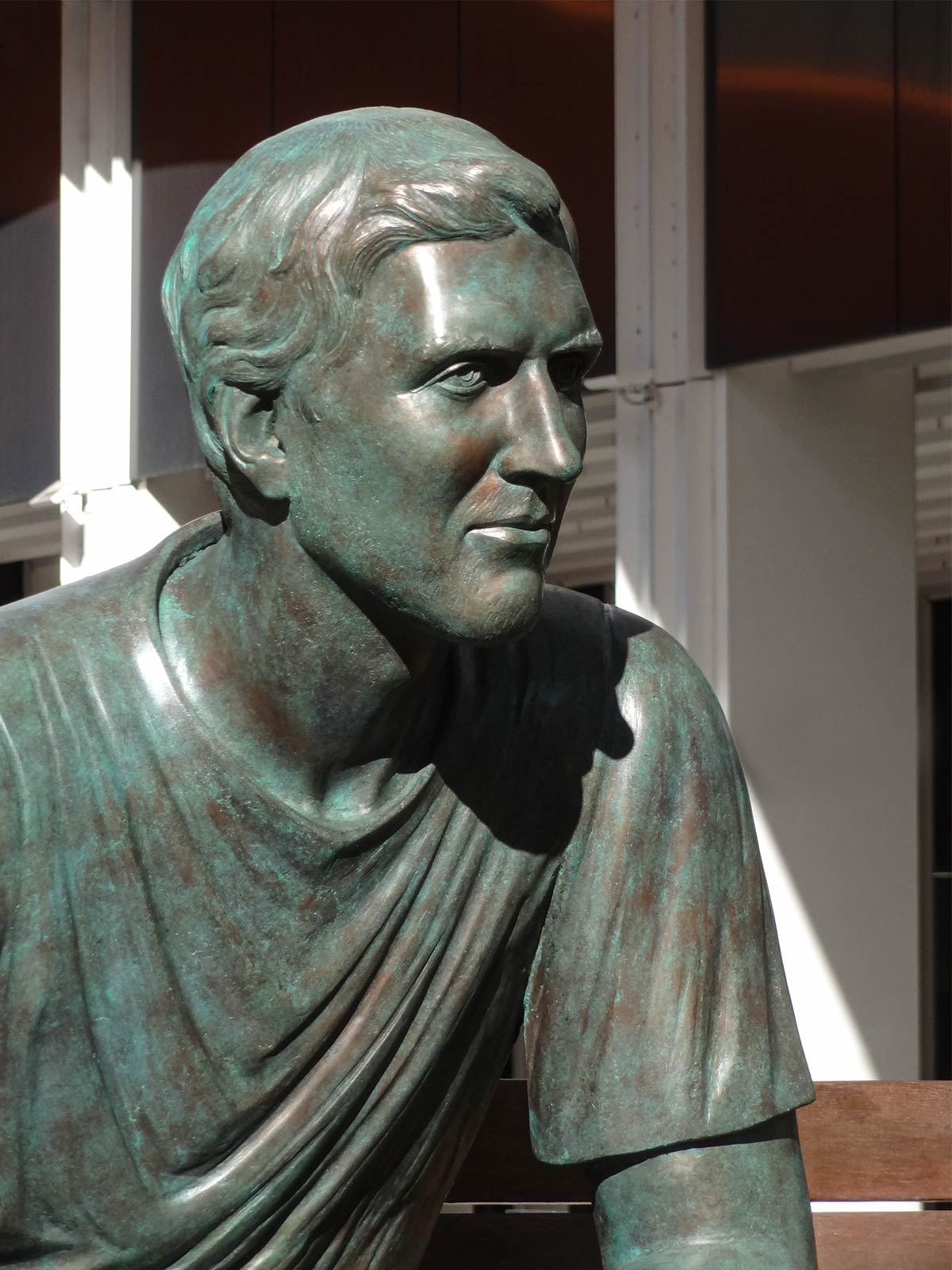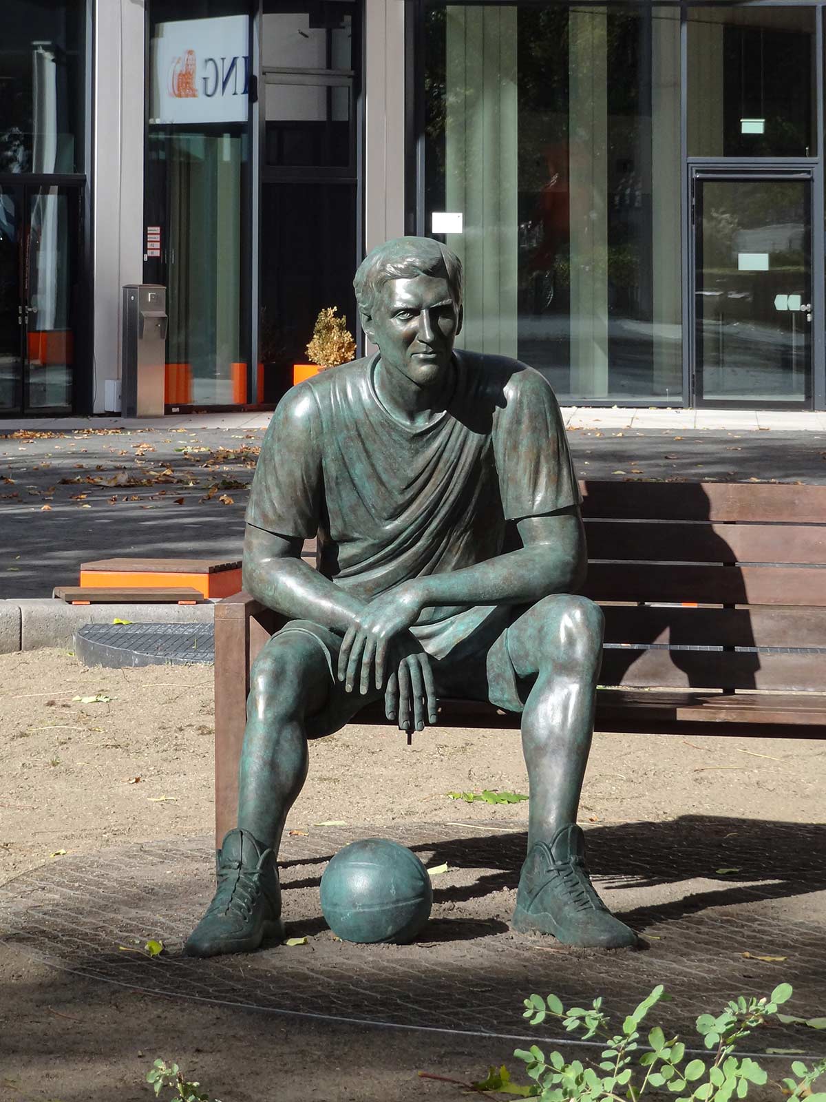 Gefunden habe ich dagegen eine Dirk-Nowitzki-Statue in Frankfurt, und zwar vor dem Hauptquartier der ING Deutschland, schräg gegenüber der Festhalle, direkt hinter dem ungewöhnlich großen und komplett in orange eingefärbten Ampelmännchen bzw. Einheitsmännchen des Künstlers Ottmar Hörl. Die Bronze-Statue, wie bereits die aus Schokolade in Köln, wurde geschaffen von Andreas Artur Hoferick und besteht aus einer Sitzbank, auf der der ehemalige Basketballer sitzt.