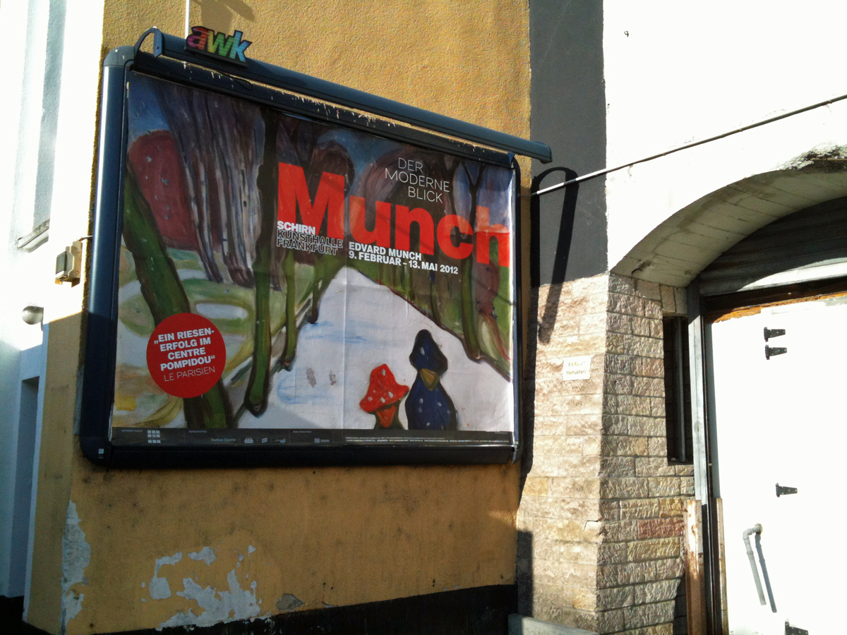 Anfang Janaur wurde ich durch eine Werbung in der Innenstadt auf die Munch-Ausstellung in Bremen aufmerksam – noch bevor ich von der Ausstellung in Frankfurt erfuhr, zog ich es tatsächlich in Erwägung, vielleicht einen Trip in den Norden zu machen. Im Web erfuhr ich, dass (nur) eine kleine Variante vom „Schrei“ dort zu sehen sei, womit ich überhaupt erstmalig davon erfuhr, dass Munch dazu neigte, ein und das selbe Motiv öfter zu malen, zuweilen auch mit mehreren Jahren Abstand dazwischen und in verschiedenen Ausführungen.