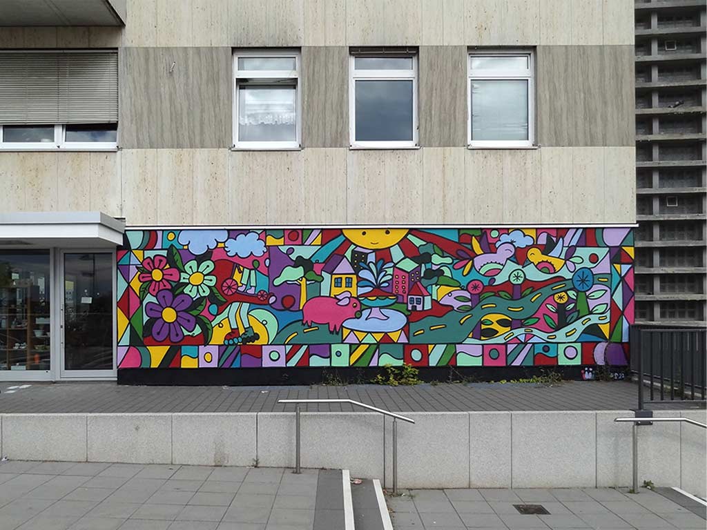 Am trostlosen Atzelbergplatz in Frankfurt-Seckbach ist kürzlich ein kleineres, sehr buntes Mural entstanden. Federführend war Thekra Jaziri aka Jazirkus, die u. a. auch schon größere Flächen an den S-Bahn-Stationen Galluswarte und Mühlberg künstlerisch umgestaltet hat. In diesem Fall ist Umgestaltung der Fläche, die auch auf ihrem Instagram-Kanal dokumentiert ist, das Ergebnis eines Kinderworkshops.