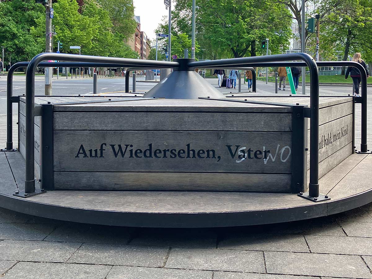 Ich habe keine Ahnung, ob rote Farbe und Parole zusammen gehören, zumal man sie auch politisch miteinander in Verbindung bringen könnte oder unabhängig voneinander drauf gesprüht wurden, aber das Ergebnis kann sich sehen lassen. Nicht. Hoffentlich folgen nach den anfangs noch halbwegs unterhaltsamen goldenen und pinkfarbene Fahrrädern nun nicht auch noch rote Skulpturen. Ich verstehe sowieso nicht, wieso derlei Aktionen auch an Kunstwerken im öffentlichen Raum fabriziert werden müssen. Erst neulich war auch das Waisenkarussel-Denkmal im Bahnhofsviertel um ein Graffiti-Tag „bereichert“ worden.