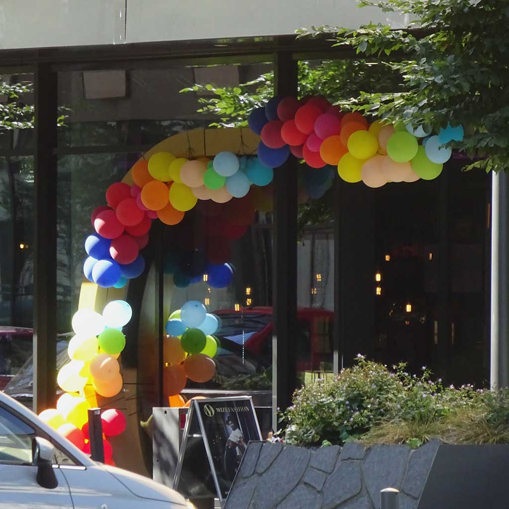 Was ist bunt, taucht quasi aus dem Nichts auf und bleibt meistens nur für kurze Zeit? Richtig, Luftballons. Was sonst? „Wir machen das mit den Fähnchen“ scheint jedenfalls nicht mehr angesagt zu sein. Eröffnung? Luftballons! Wiederöffnung? Luftballons! Geburtstag oder anderes Jubiläum? Luftballons! Die anderen machen was mit Luftballons? Luftballons! Hier eine kleine Auswahl, mit Ballonbögen und -girlanden, ein- und mehrfarbig, aufgenommen zwischen April und Oktober dieses Jahres. Wo fing das an und wann?
