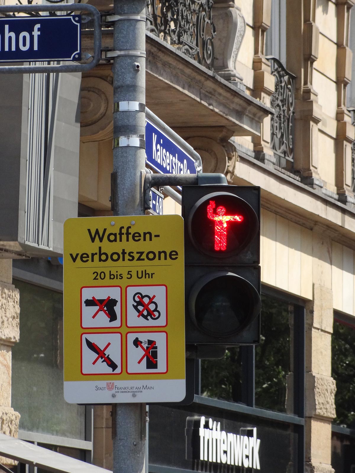 Dauerhaft im Einsatz sind in Frankfurt übrigens diese beiden Ampelmännchen-Variationen: An der Konstablerwache, wo gleichgeschlechtliche Paare abgebildet sind und in Sachsenhausen, wo Frau Rauscher zu sehen sind. Eine Ampel für Autofahrer*innen wurde auch schon umgestaltet, nämlich so, dass das Wappen von Eintracht Frankfurt (Rot), ein Geripptes (Gelb) und ein Marihuanablatt (Grün) angezeigt werden. Das war allerdings nichts Offizielles, sondern eine (durchaus ungewöhnliche) Streetart-Aktion und somit nur von kurzer Dauer.