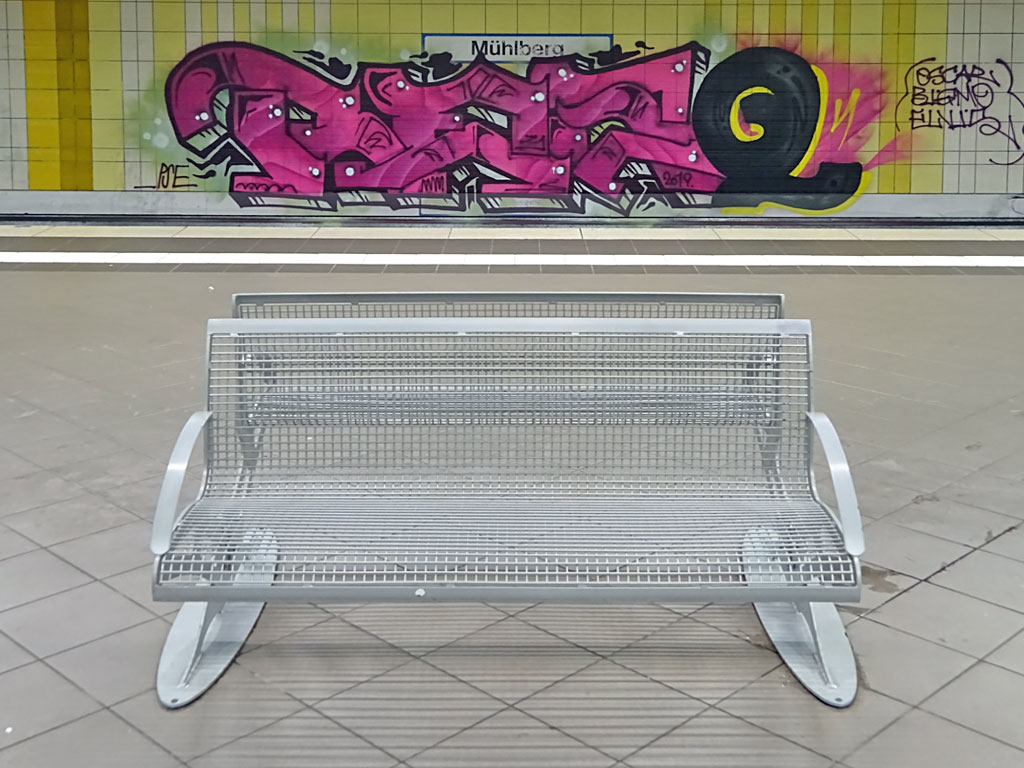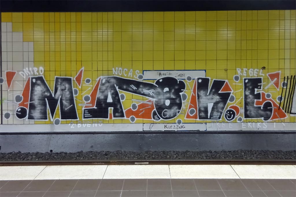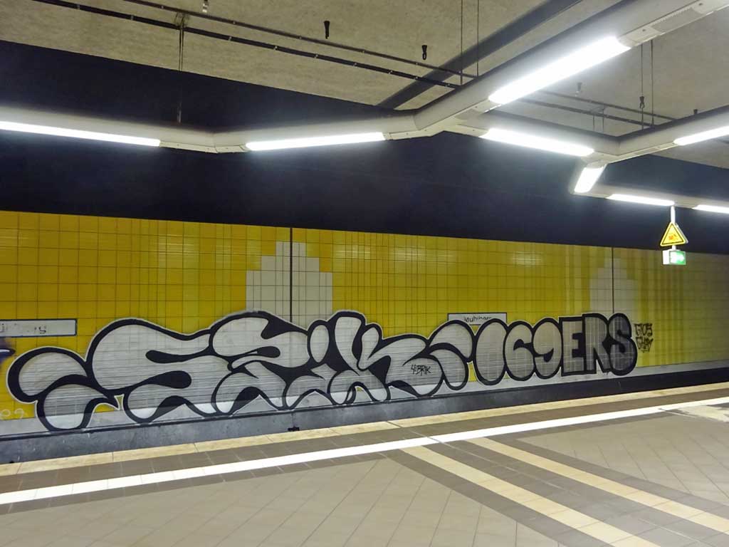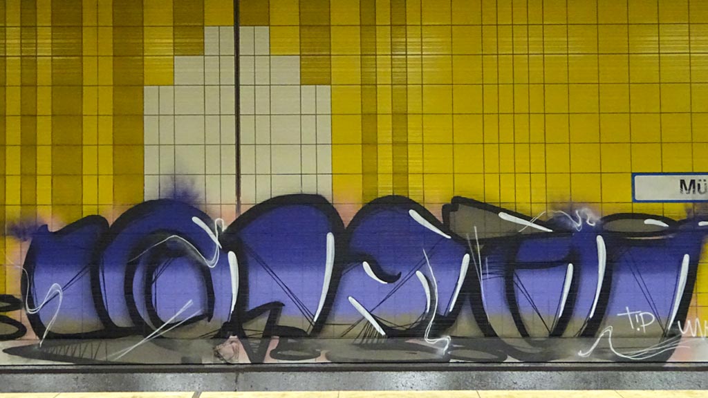 Nachdem im vergangenen Jahr sämtliche Graffiti an den Wänden der S-Bahn-Station Frankfurt-Mühlberg entfernt wurden, sind die größtenteils aus gelben Fließen bestehenden Wände wieder mit dem einen oder anderen Sprühwerk versehen worden. Da zwischenzeitlich aber auch schon andere Graffiti zu sehen waren, als auf den hier gezeigten Fotos, muss man wohl davon ausgehen, dass die Flächen in deutlich kürzeren Intervallen gereinigt werden.