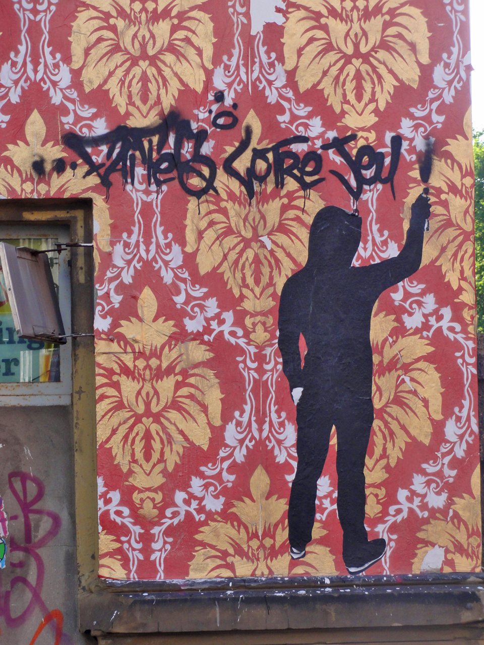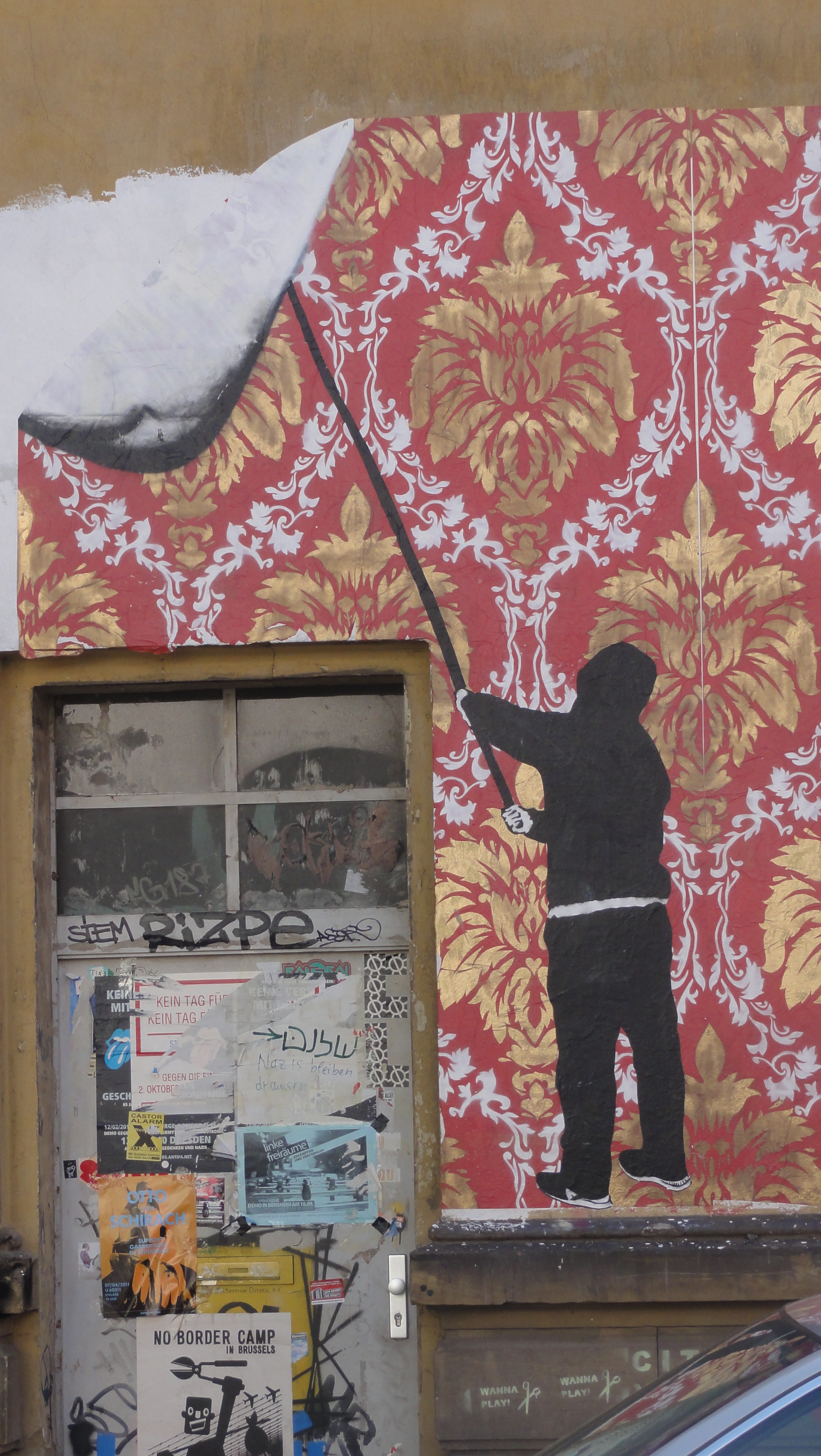 Warum Tapeten nur im Inneren eines Hauses verwenden, wenn sie als Fassadenverzierung auch ihre Wirkung entfalten kännen? Aktuelles Beispiel hierfür: Das ehemalige Polizeigefängnis Klapperfeld in Frankfurter Innenstadt.