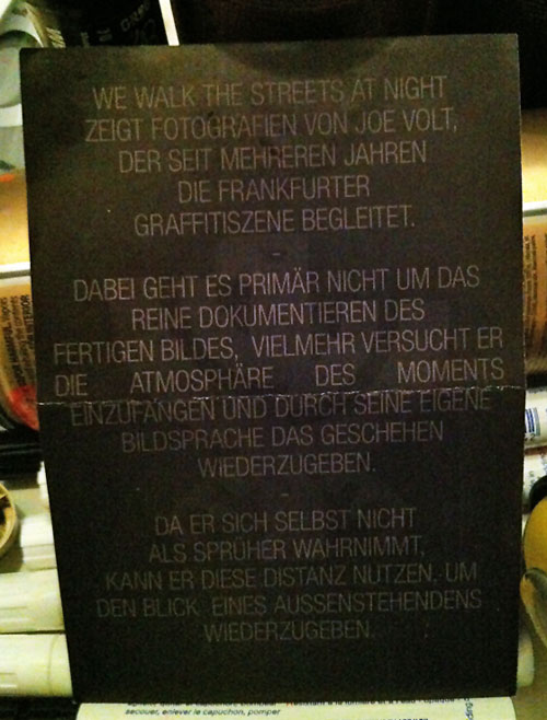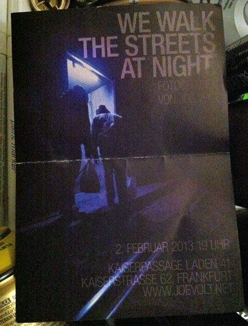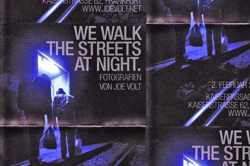 Es wurden schon viele Infos zu diesem Event im Internet veröffentlicht, aber jetzt wird es konkret: Die für einen Tag geplante Ausstellung „We walk the streets at night“ mit Fotografien zur Frankfurter Graffitiszene von Joe Volt findet am 2. Februar 2013, ab 19 Uhr, in der Kaiserpassage (Laden 41) im Frankfurter Bahnhofsviertel statt.