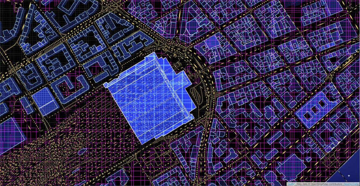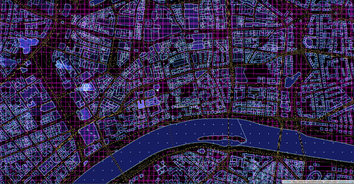Pink-farbenes Raster, schwarzer Grund, blaue Gebäude und animierte Bewegungsströme in gelb lassen sich nicht nur für Frankfurt, sondern auch für andere Orte auf der Welt darstellen. Hierfür muss man auf latlong.net den gewünschten Ort eingeben, sich die Latitude- und Longitude-Werte notieren und abschließend ans Ende der URL einsetzen, die für Frankfurt am Main wie folgt aussieht: http://tangrams.github.io/tangram-docs-assets/?procedural/tronish.yaml#17/50.11026/8.68342 (via basicthinking.de)