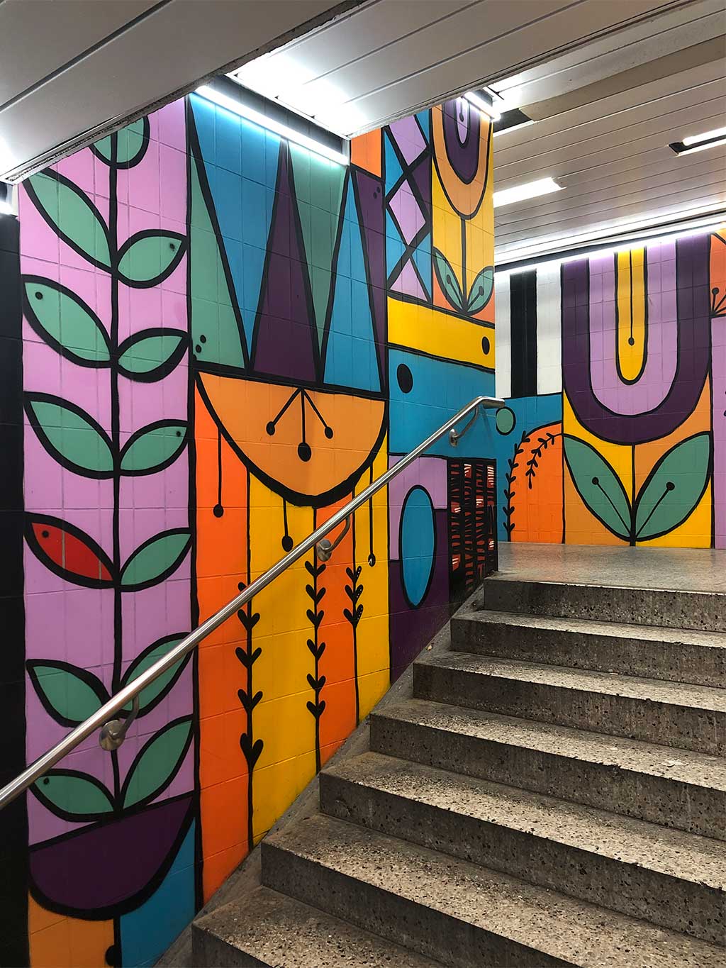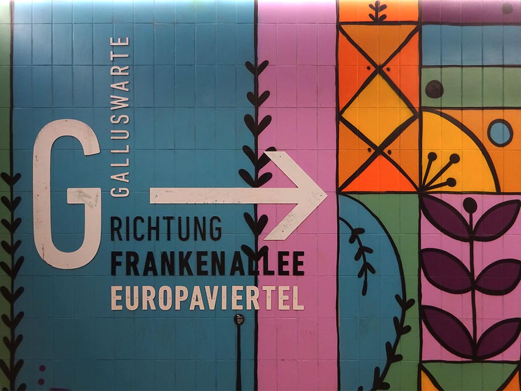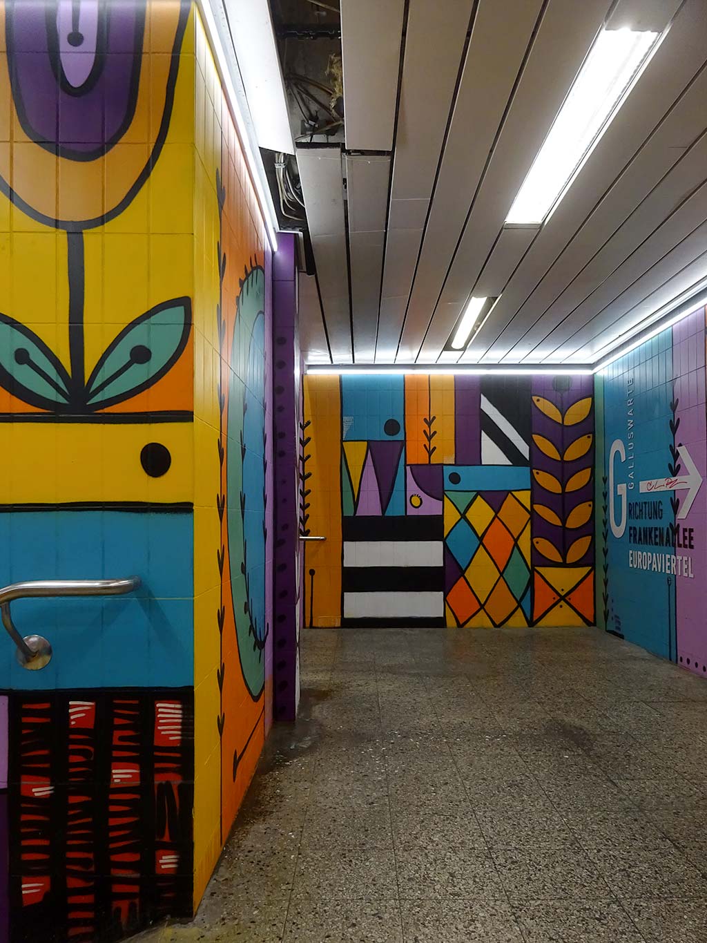 Nach vergleichbaren Arbeiten in Offenbach (Hafengebiet, S-Bahn-Haltestelle Marktplatz) ist die Künstlerin Thekra Jaziri auch in Frankfurt am Main aktiv. Zusammen mit Florian Lübke wurde eine 30 Meter lange Wand entlang der Rolltreppe an der Haltestelle in Frankfurt-Mühlberg gestaltet und kürzlich folgte eine rund 350m² große Fläche in der S-Bahn-Station Galluswarte. Auch diesmal dominieren bunte Elemente, eckige und runde Formen, Linien und ein paar florale Motive.