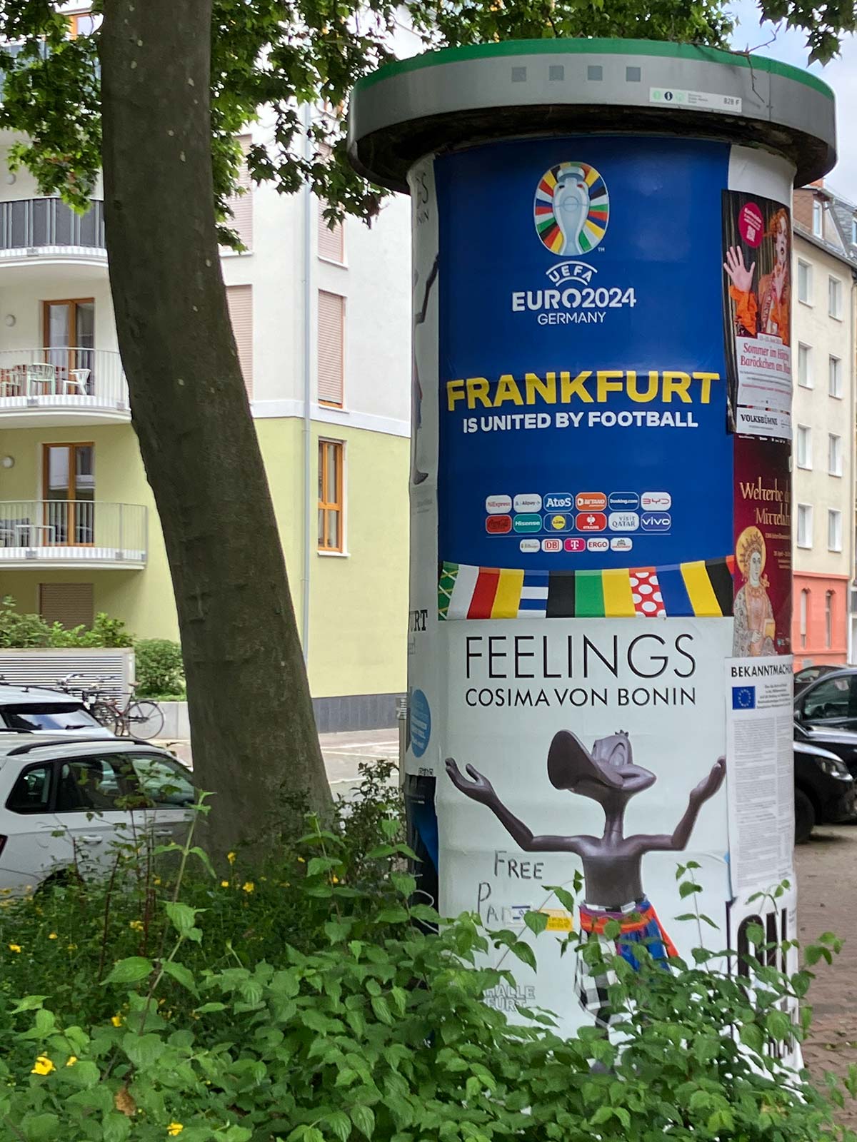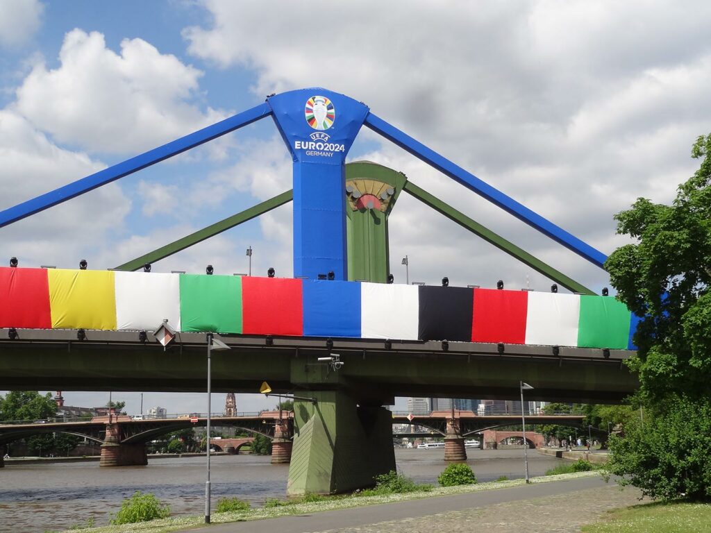 In diesem Jahr ist zwar nicht wieder „die Welt zu Gast bei Freunden“, dafür aber „United by Football. Vereint im Herzen Europas“. Zumindest rollt unter diesem Motto vom 14. Juni bis zum 14. Juli 2024 bei der EURO 2024 in zehn deutschen Städten, darunter auch Frankfurt am Main, der Ball. Je näher der Auftakt des Turniers rückt, umso mehr wird man, ob man es möchte oder nicht, auf dieses Sportereignis aufmerksam, sei es im öffentlichen Raum durch Dekoration und Werbung oder anhand von Produkten und Werbemitteln in Kaufhäusern und Supermärkten. Hier eine Übersicht mit Fotos aus Frankfurt, die ich im Vorfeld der Europameisterschaft, von Mitte April bis heute, gemacht habe.