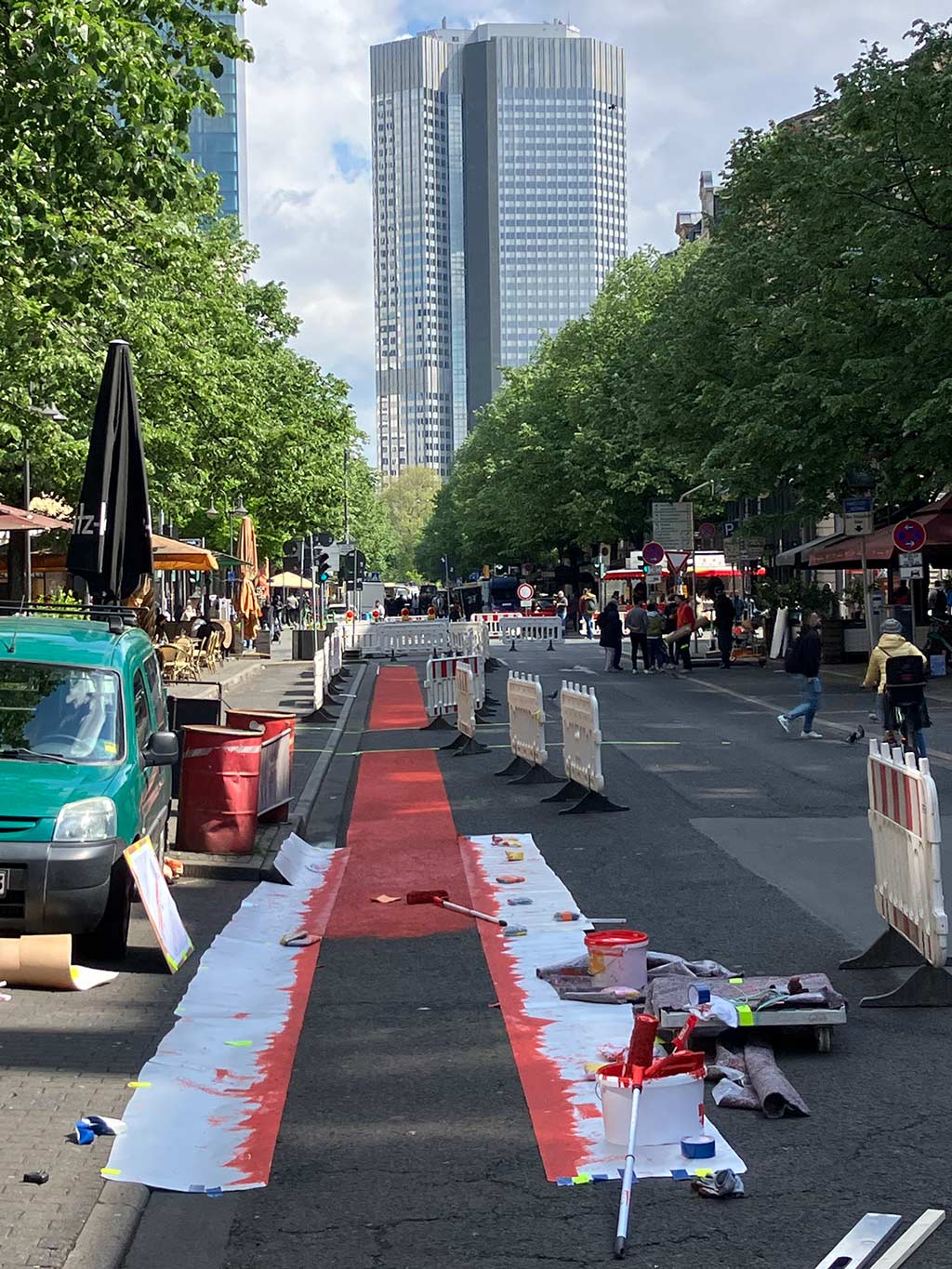 Den Auftakt machten Mitte April die sogenannten Guidelines, die Bemalung der Fahrbahn in Form von Pfeilen mit Wegweiser-Funktion am Kaisersack im Bahnhofsviertel. Kurz nachdem die englische Boulevardzeitung „The Sun“ in menschenverachtender Weise die Situation im Frankfurter Bahnhofsviertel als „Zombieland“ bezeichnet hatte, wurden in Frankfurt die Farbeimer ausgepackt und fleissig Farbe auf die Fahrbahn aufgetragen, ebenso, wie man das in Frankfurt schon gewohnt ist, z. B. von Open-Air-Events in eben jenem Bahnhofsviertel, aber auch vom einst gesperrten Mainkai. Daraufhin gab es Stimmen, die diese Wegweiser als Reaktion der Stadt Frankfurt auf die „Sun“ verstanden hatten und das kritisierten. Ebenso kritische Stimmen gab es, weil diese Pfeile nur Orte außerhalb des „Zombieland“ anpreisen. Das wunderte mich etwas, denn nur weil der Hauptbahnhof (Stadtteil Gallus) an das Bahnhofsviertel grenzt, muss man nicht zwangsläufig auch Locations im Bahnhofsviertel anpreisen, denn die Leute kommen in ersten Linie immer noch nach Frankfurt, und nicht ins Bahnhofsviertel, und außerdem ist die Stadt Frankfurt eigentlich nicht gerade dafür bekannt, heute etwas zu beschließen und es gleich morgen umzusetzen. Ich hatte zwar schon Ende vergangenes Jahres mitbekommen, dass der Kaisersack aka demnächst (auch) Kaisertor generell umgestaltet werden soll, allerdings nie etwas davon gelesen, dass auch solche Guidelines für EM-Besucher*innen Teil davon sein sollen, geschweige denn überhaupt etwas Konkretes zum Ideenwettbewerb oder womöglich einer dazugehörigen Ausschreibung gelesen. Auf jeden Fall war der gewählte Zeitpunkt, um damit zu beginnen, eher suboptimal – und wenn ich ehrlich bin, auch das Ergebnis. Wie oft wurde das eigentlich mittlerweile übermalt, weil es zwischenzeitlich schon äußerst bescheiden aussah? Von der Sinnhaftigkeit eines Leitsystems dieser Art ganz zu schweigen, zumal Rad- und Autofahrer*innen weiterhin diese Abschnitt befahren.