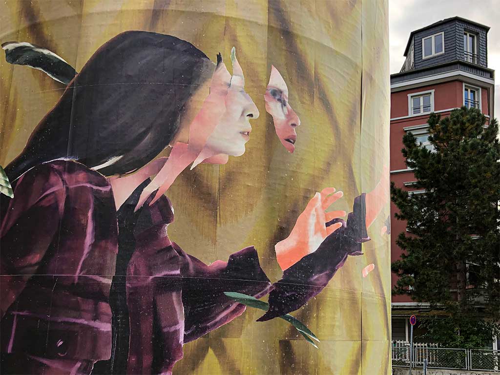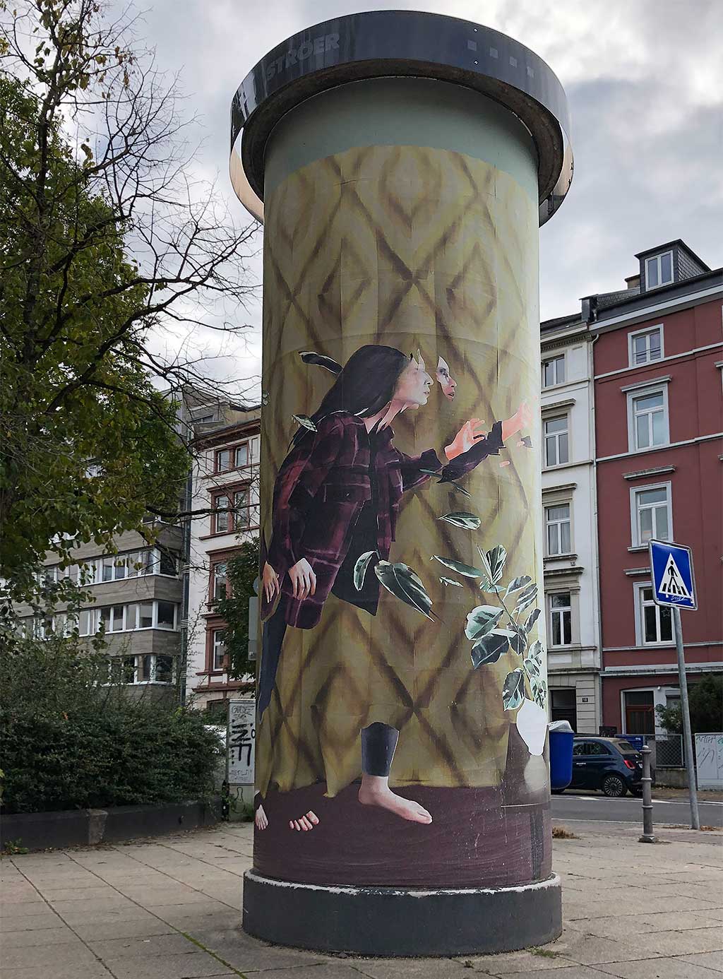 „In der farbgewaltigen und durch Zerstückelung surreal anmutenden Arbeit findet sich die junge Protagonistin in einem stilisierten Interieur in einer Bewegung zwischen den Zeiten: Sie strebt nach vorn, doch gleichzeitig ist sie in der Vergangenheit gefangen. Auf der runden KunstSäule dreht sich diese das Bild umspannende Figur um sich selbst.“ (frankfurter-kunstsaeule.de)