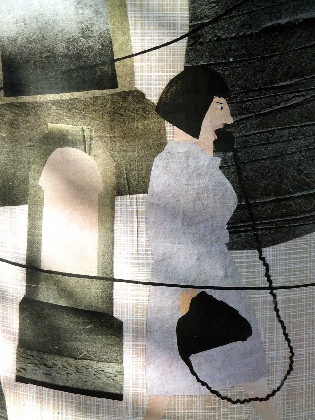 „Alter Baumbestand, Grab- und Gedenksteine – ein gewachsenes Kleinod inmitten eines Wohngebietes, das ist der Alte Friedhof am Brückenstraßenspielplatz. Auf der Arbeit von Ljuba Stille versuchen Menschen, noch der analogen Zeit verhaftet, den Verwirrungen der Telekommunikation zu entkommen – doch es scheint, dass sie sich rastlos mehr und mehr in sich selbst und in ihrer kargen Lebenswelt verstricken.“ (frankfurter-kunstsaeule.de)