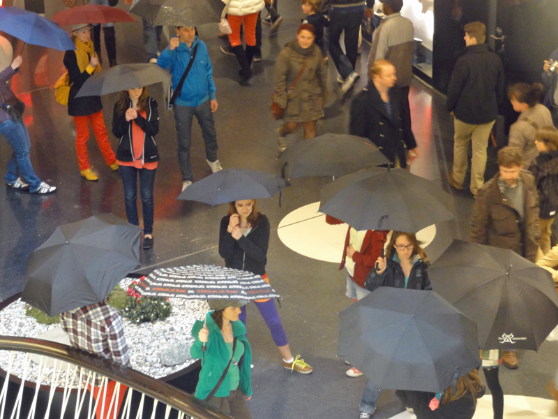 Es ist schon fast zwei Wochen her, daß das Einkaufszentrum MyZeil in der Frankfurter Innenstadt als Schauplatz für einen Freeze-Flashmob herhielt. Leider sind am besagten Tag nicht wirklich all zu viele Leute erschienen, was für einen Flashmob eher suboptimal ist, wirkt dieser bei einer beeindruckenden Anzahl von Teilnehmern doch erst so richtig. Umso mehr Eier (oder Vergleichbares) braucht es, daß die überschaubarer Menge die sich an diesem Tag zusammengefunden hat die Aktion nicht platzen ließ, sondern sich dennoch mit aufgespannten Regenschirm eine Zeit lang regungslos im Einkaufszentrum hinstellte.