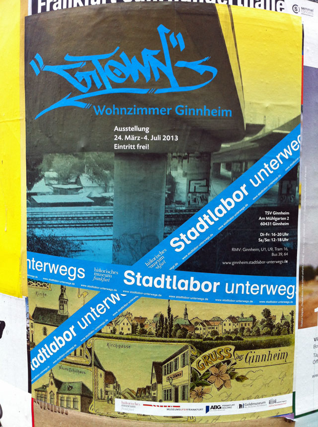 G-Town. Wohnzimmer Ginnheim findet vom 24. März bis 4. Juli 2013 statt. Die Ausstellungseröffnung ist am 23. März 2013 um 18 Uhr im Vereinsheim des TSV Ginnheim, Am Mühlgarten 2 in 60431 Frankfurt am Main.