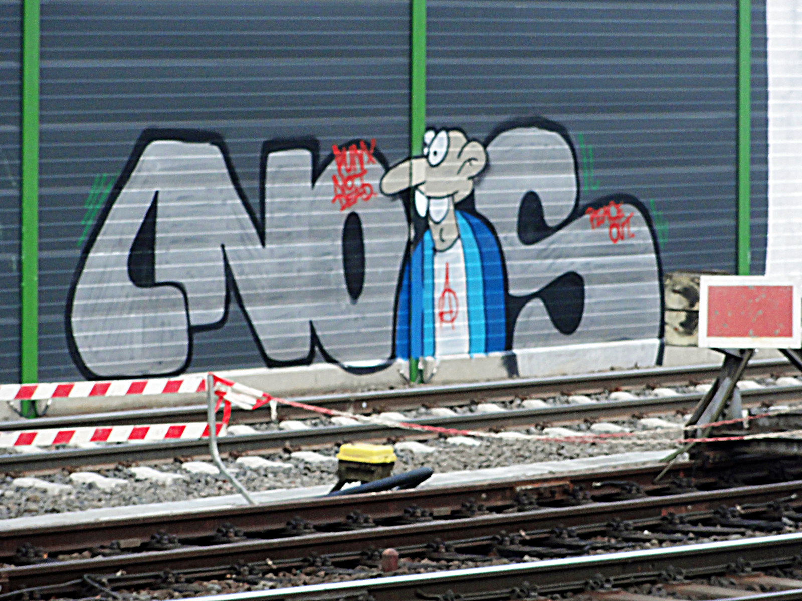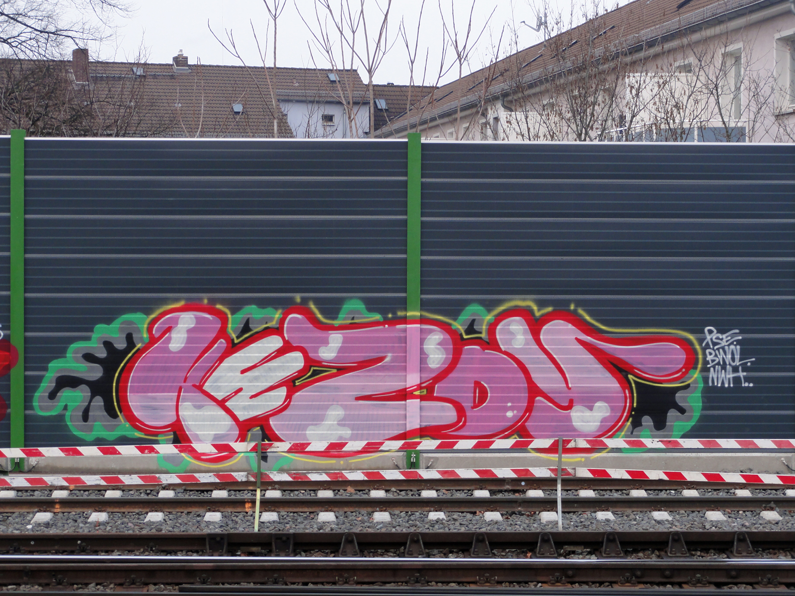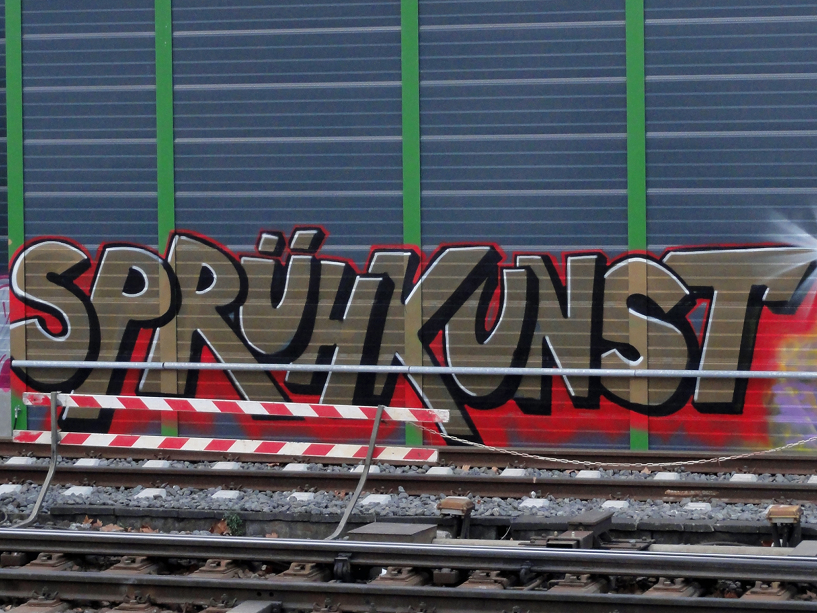 Hier einige aktuelle Fotos von der Lärmschutzwand entlang der S-Bahn-Station an der Galluswarte in Frankfurt. Dadurch, daß das obere Drittel bisher zumeist ungenutzt blieb, kann man noch erahnen, wie trist diese graue Vorrichtung ohne derlei Bemalungen und Beschriftungen aussehen würde. Etwas Farbe tut hier nicht nur gut, sondern erscheint geradezu notwendig.