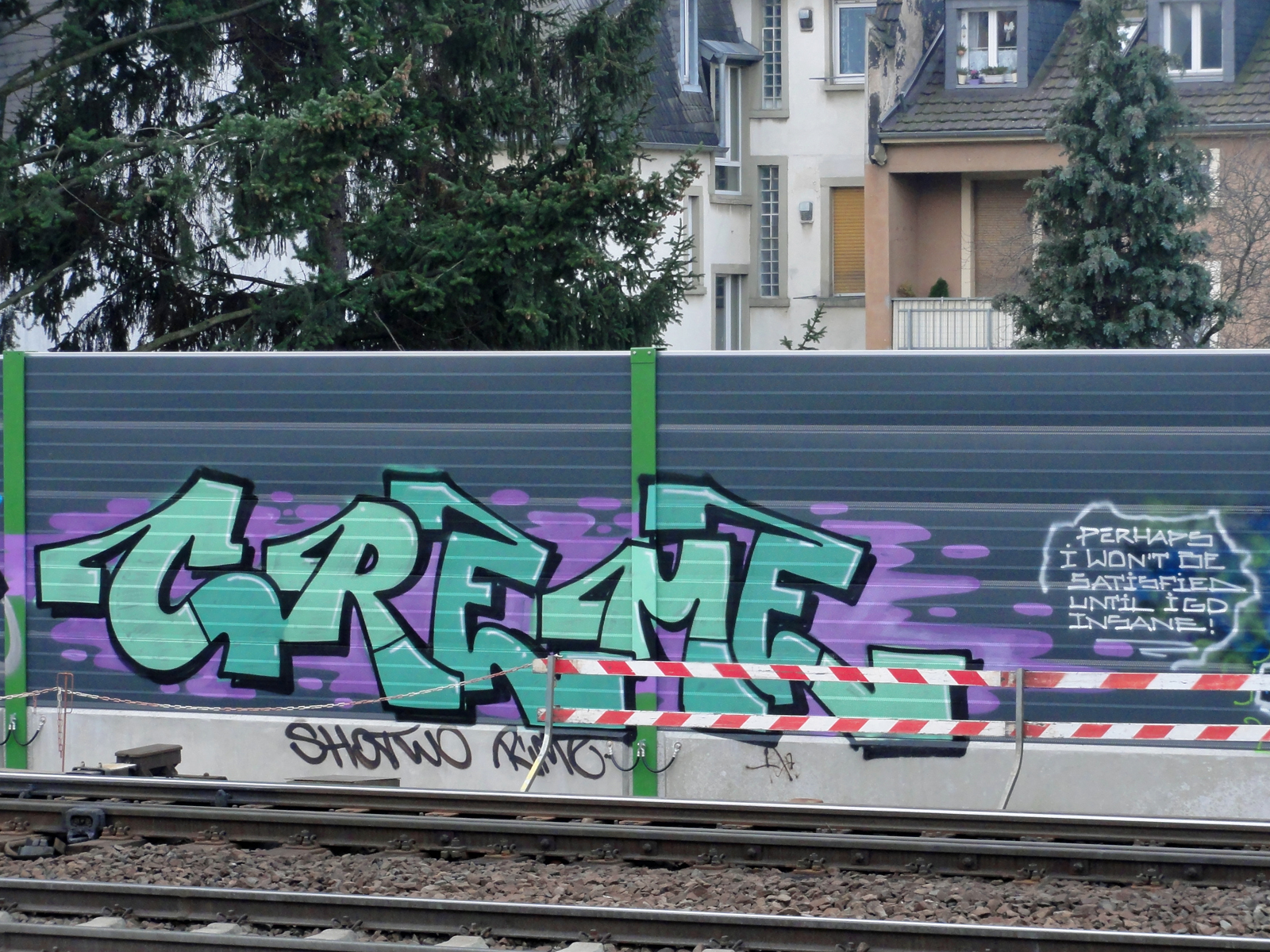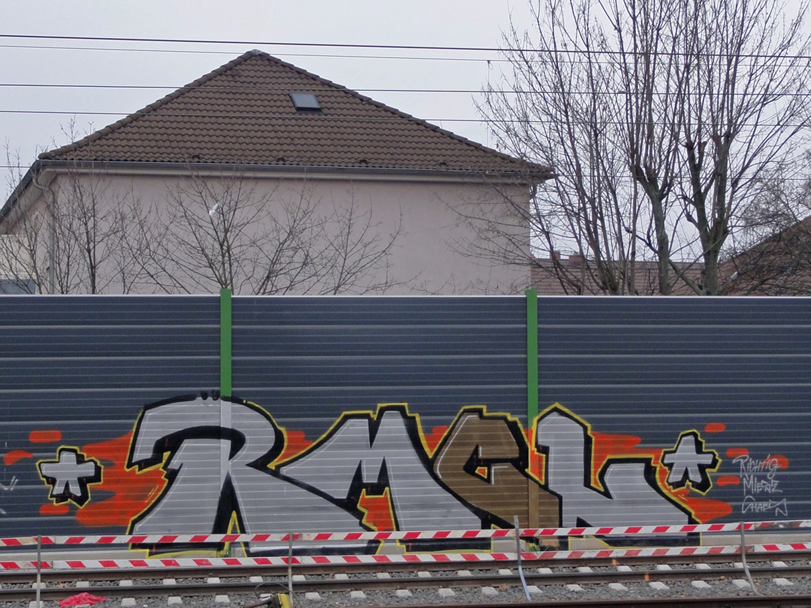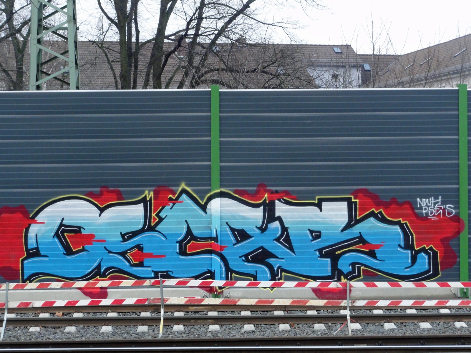 Hier einige aktuelle Fotos von der Lärmschutzwand entlang der S-Bahn-Station an der Galluswarte in Frankfurt. Dadurch, daß das obere Drittel bisher zumeist ungenutzt blieb, kann man noch erahnen, wie trist diese graue Vorrichtung ohne derlei Bemalungen und Beschriftungen aussehen würde. Etwas Farbe tut hier nicht nur gut, sondern erscheint geradezu notwendig.