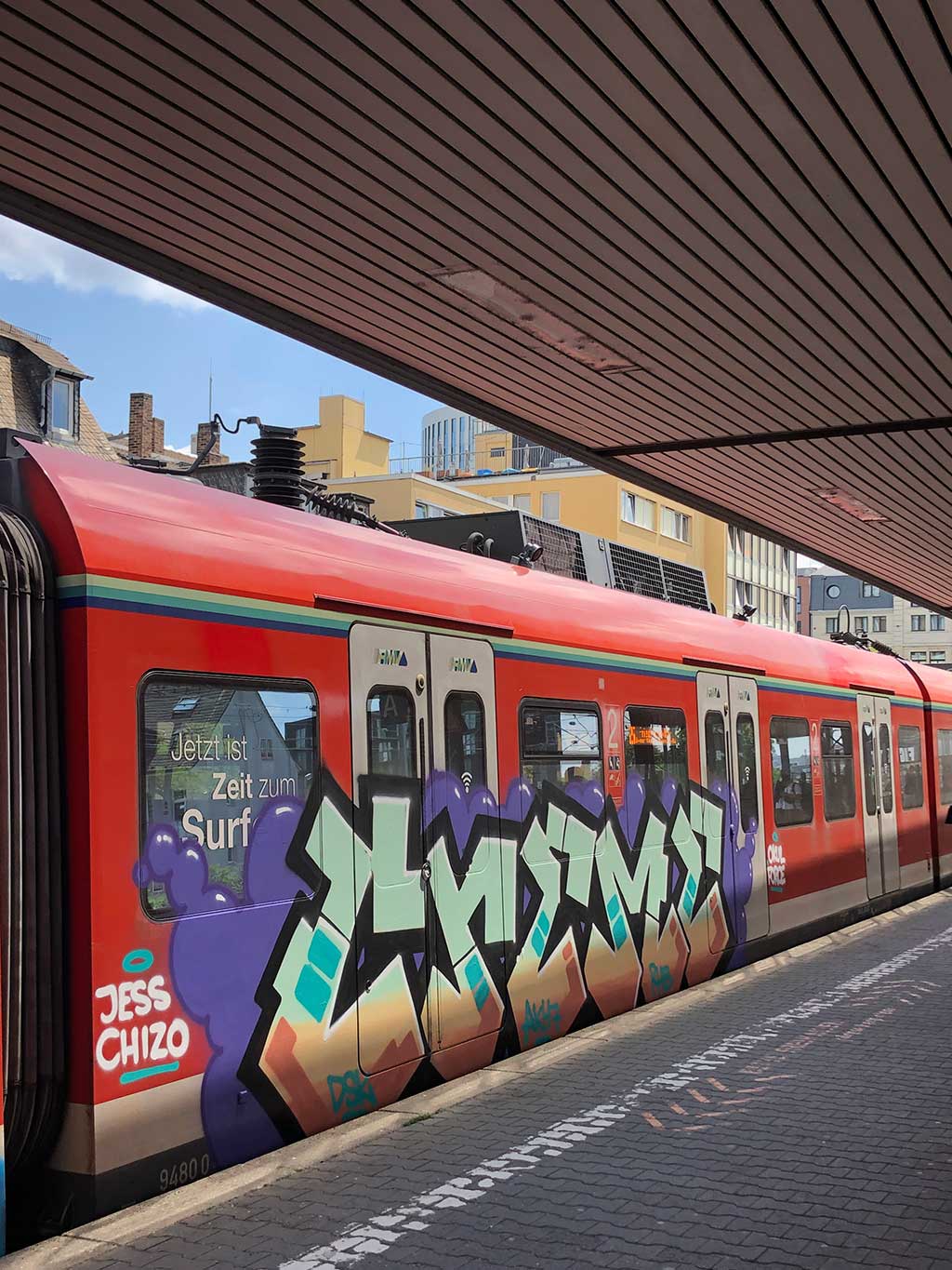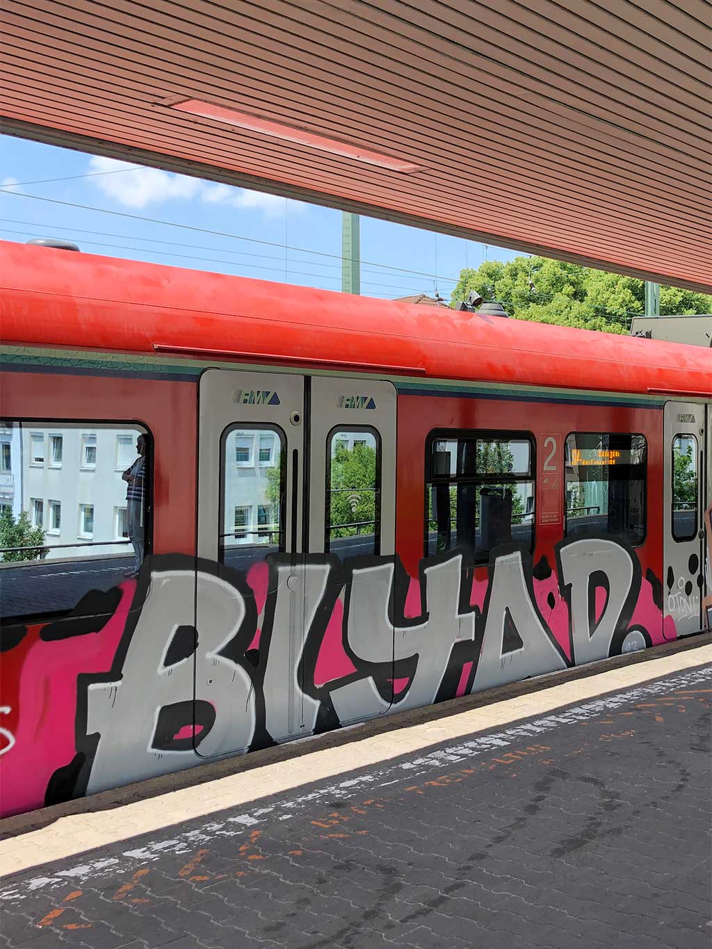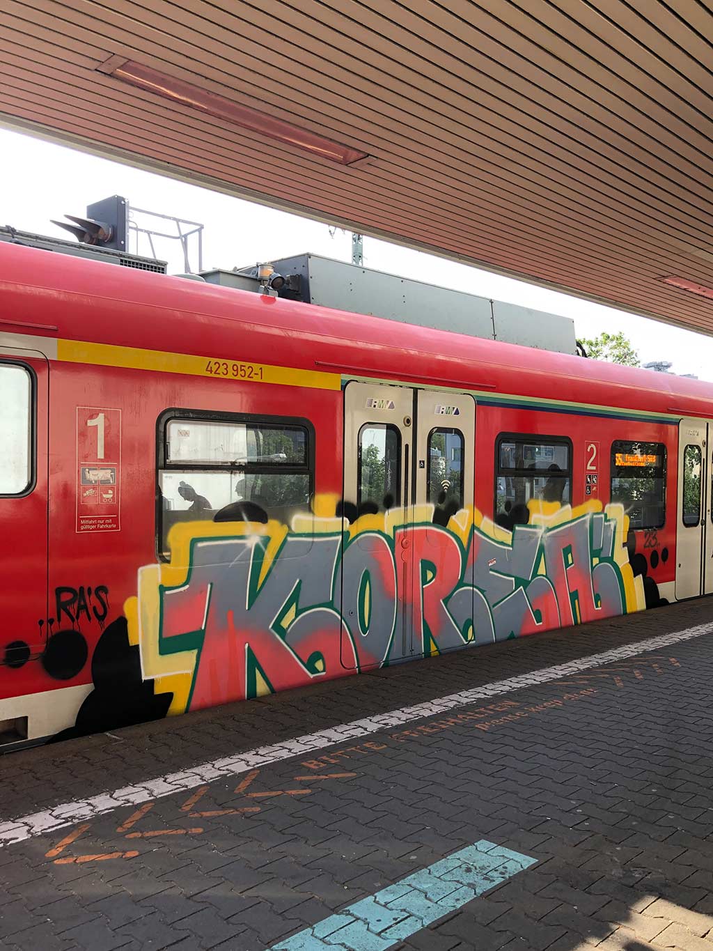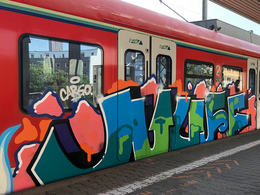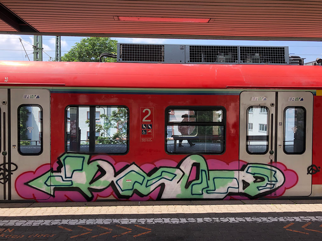 Während Grünpflanzen teilweise manch ein Sprühwerk auf der Schallschutzwand entlang der S-Bahn-Station Galluswarte verdecken, ist bei den dort haltmachenden S-Bahnen weiterhin eine einwandfreie Betrachtung solcher Arbeiten möglich. Aktuell sieht es z. B. wie folgt aus: