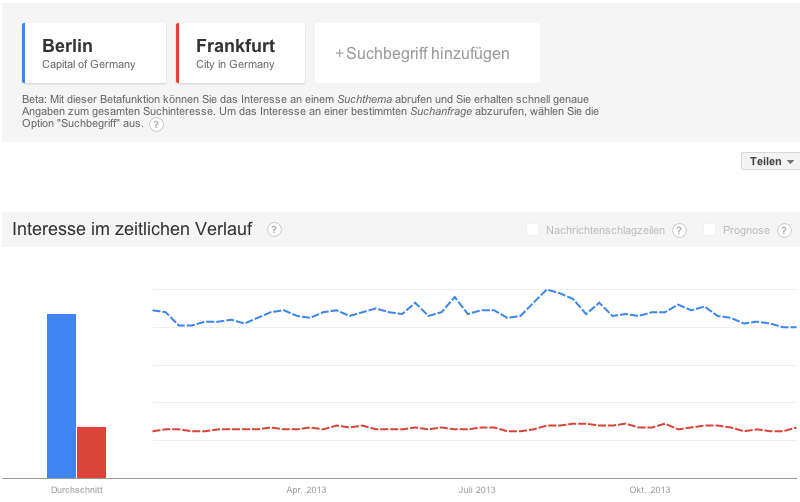 Über die „Erkunden“-Funktion kann man Frankfurt als Stadt hinzufügen und mit anderen Städten direkt vergleichen oder sich die für Frankfurt relevanten Suchbegriffe anzeigen lassen.