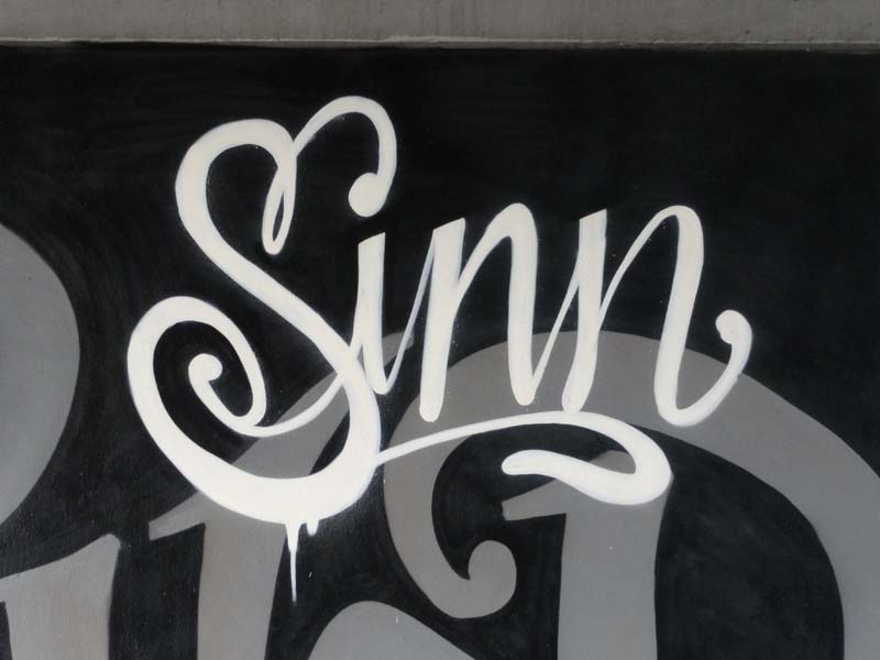 Dank eines Hinweises habe ich mich neulich auf dem Weg zum Main begeben, und zwar an eine Ecke, wo ich eher seltener bin. Unterhalb der Friedensbrücke befinden sich auf schwarzen Grund in grau und weiß gehaltene, zumeist einzelne, Wörter wie Leben, Glaube, Relax, Straße, Weg und eben auch die vier, die auf den Fotos hier im Beitrag zu sehen sind.