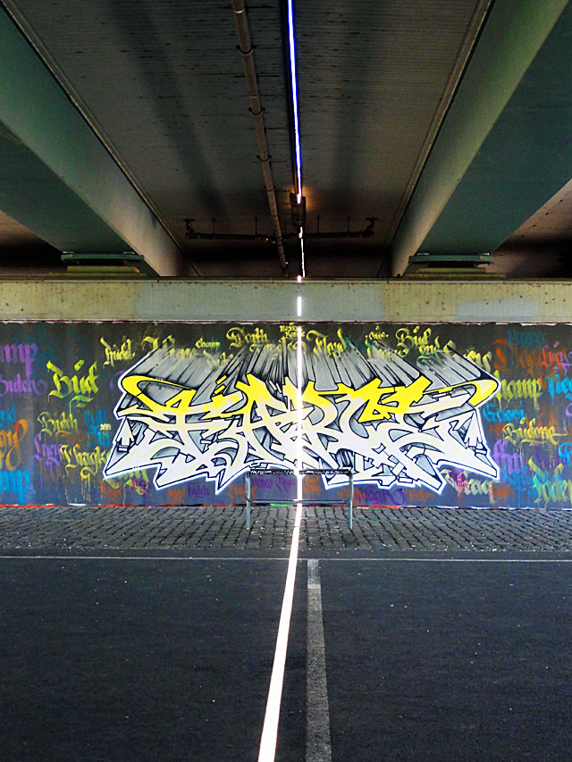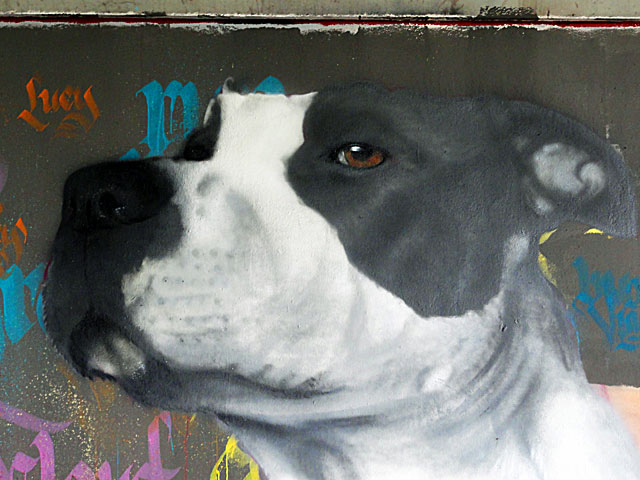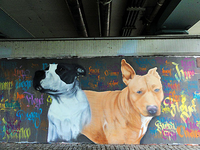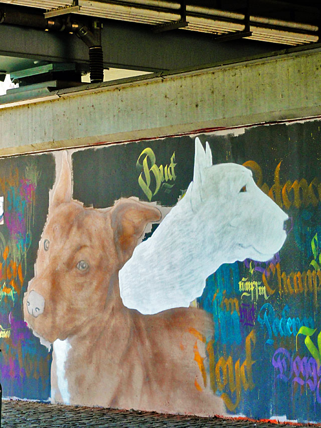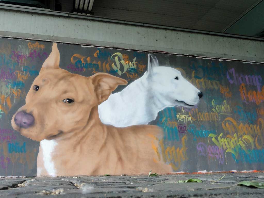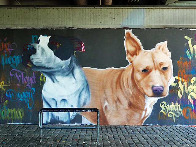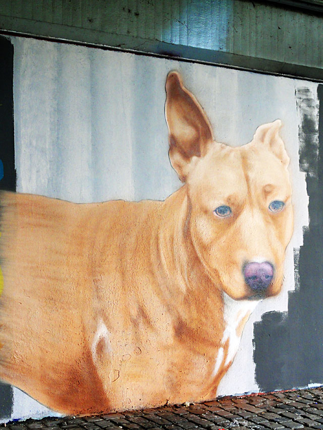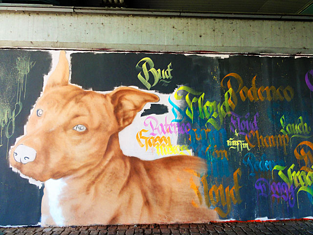 Wie bereits vor einer Woche in Graffiti an der Friedensbrücke – Auf den Hund gekommen (1) angekündigt, folgen heute die Fotos von der anderen Wand. Im unteren Bereich dieses Beitrags gibt es außerdem einige Fotos, die das entstehende Werk zu unterschiedlichen Zeitpunkten zeigen.