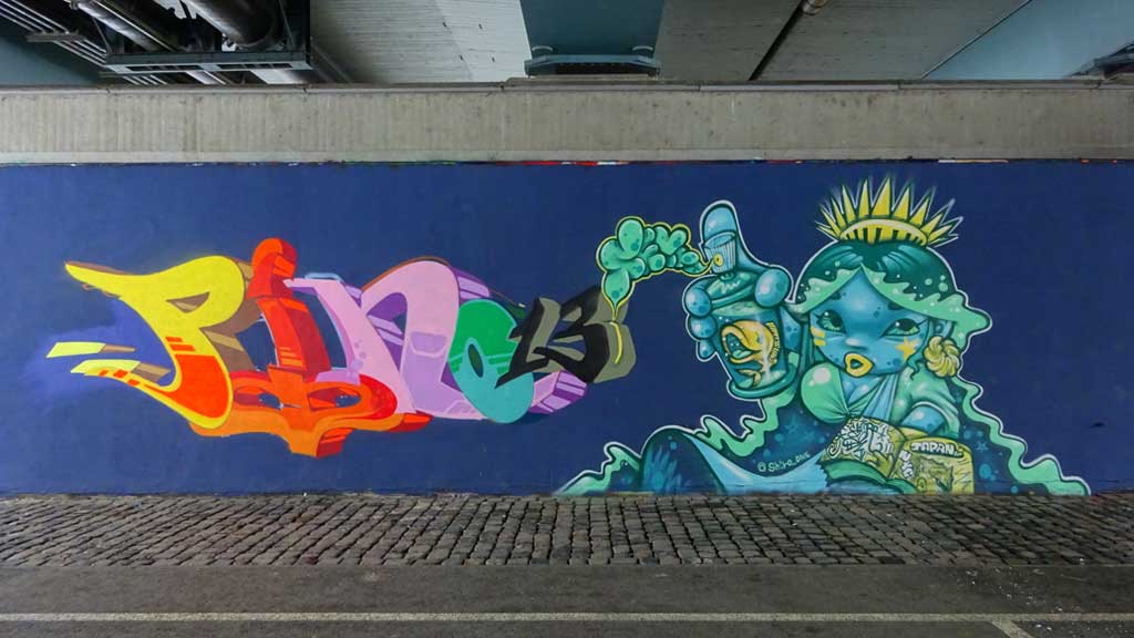 Anlässlich der diesjährigen Creativeworld-Messe in Frankfurt am Main, war auch die japanische Graffitikünstlerin Akiko „Shiro“ Miyakami in der Stadt zugegen. Sie malt seit 1998 und ihr Wirken ist in Form von großformatigen Graffitiprojekten, Auftragsarbeiten und Ausstellungen in Kunstgalerien in Japan, Europa und den USA zu sehen. An den Flächen der Freiluftgalerie Frankfurt an der Friedensbrücke hat sie einen Freiheitsstatue-Character gemalt.