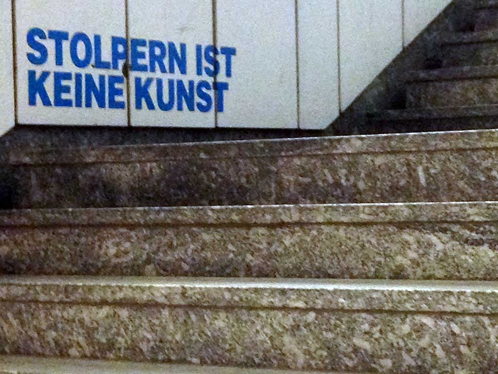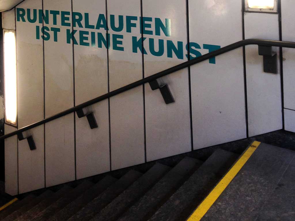 Nur eine Haltestelle weiter, an der U-Bahn-Station Dom/ Römer, wurde der Aufgang der zur Schirn Kunsthalle und dem Frankfurter Kunstverein führt, vor einigen Jahren ebenfalls mit zahlreichen Sprüchen, wie z.B. „In die Schirn gehen ist keine Kunst“, „U-Bahn-Fahren ist keine Kunst“ oder auch „Runterlaufen ist keine Kunst“, umgestaltet. Die Texte dort sind groß, aber nicht so riesig wie die einst am Willy-Brandt-Platz, dafür aber farblich.