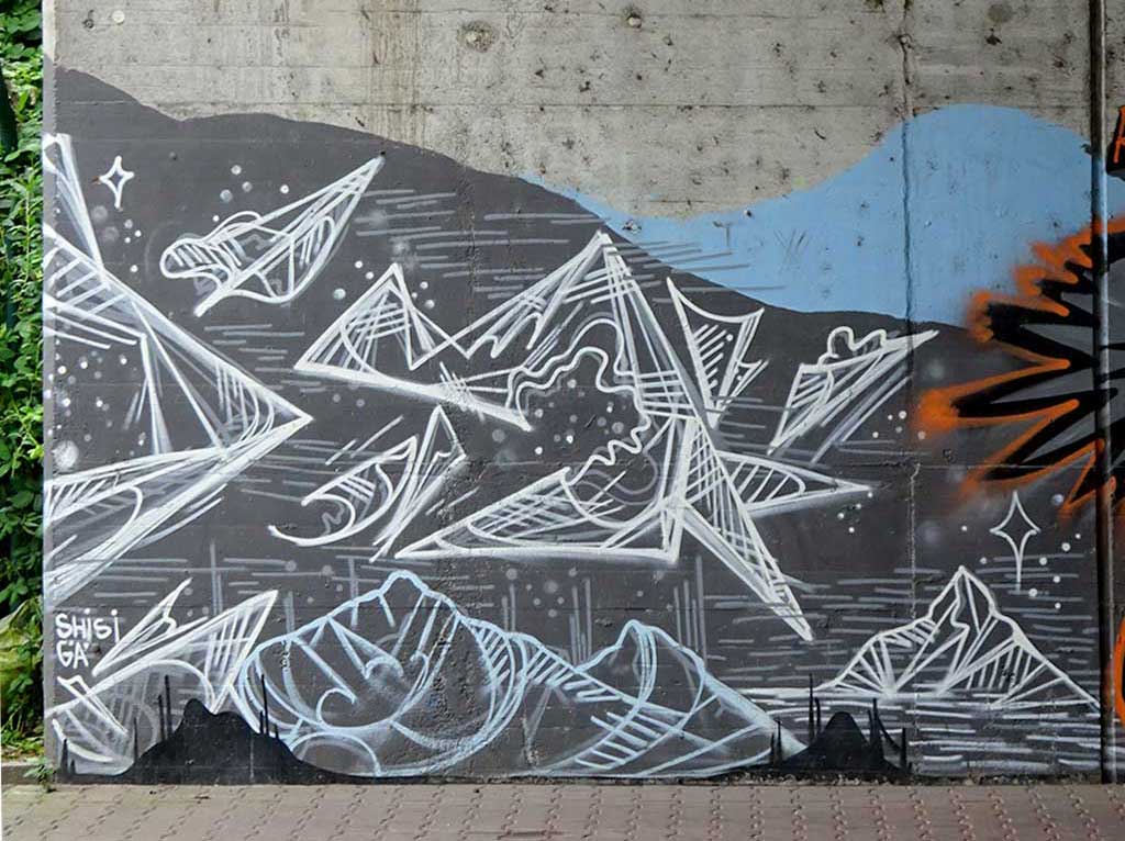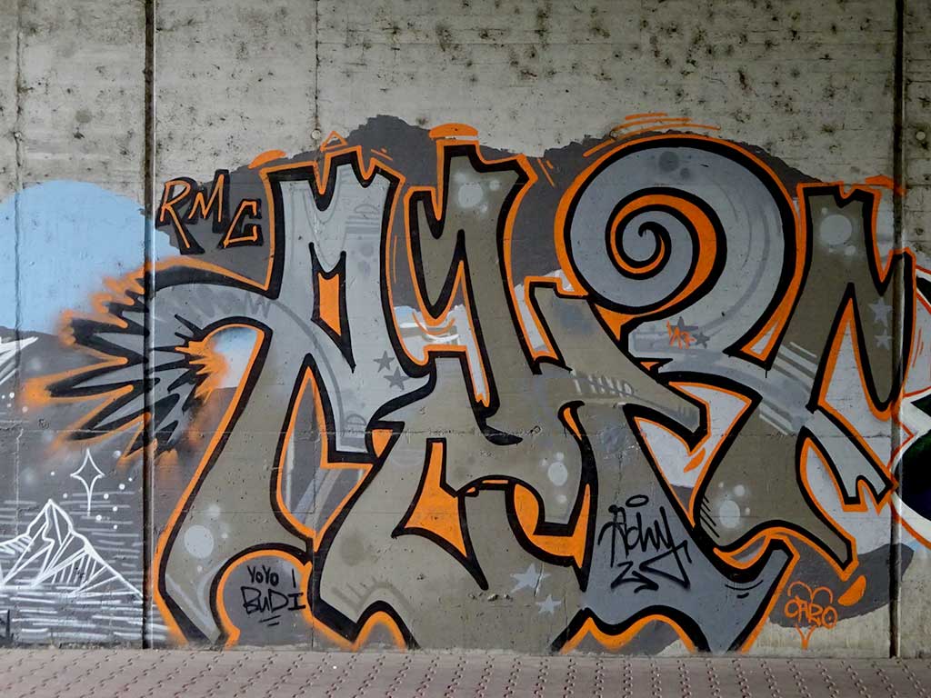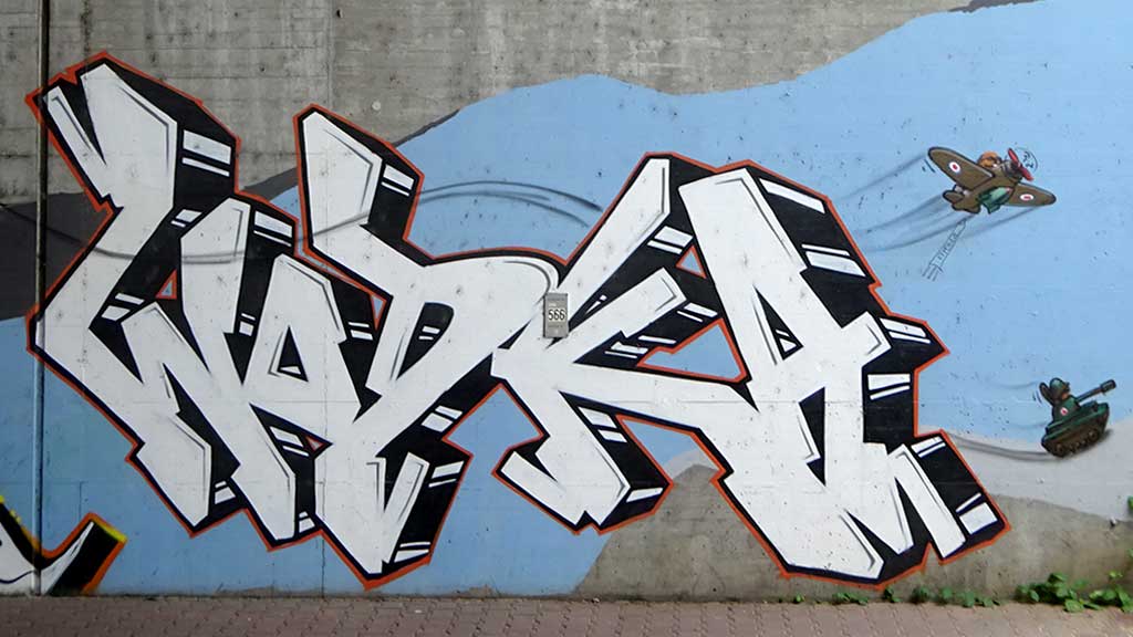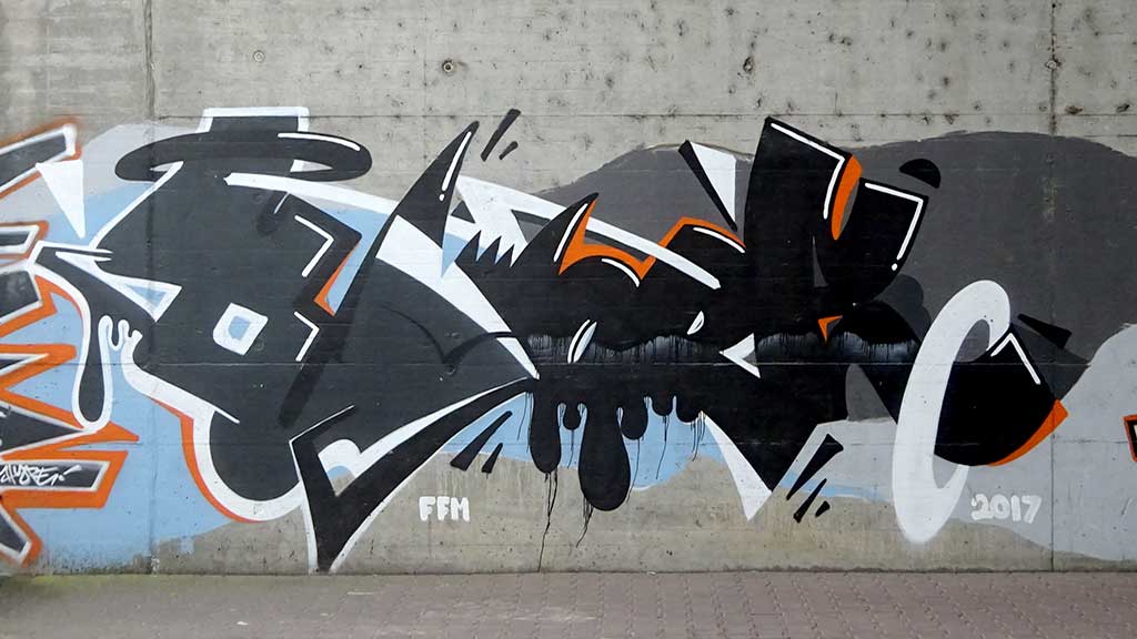 Beim Projekt Bunte Brücke aus dem Jahr 2017 gestalteten einige Frankfurter Urban-Art-Künstler gemeinsam mit Geflüchteten zwei Wände in den Stadtteilen Gallus und Griesheim. Gegenüber der Wand in Griesheim befinden sich die folgenden Sprühwerke, möglicherweise parallel dazu, mindestens jedoch im selben Jahr entstanden.
