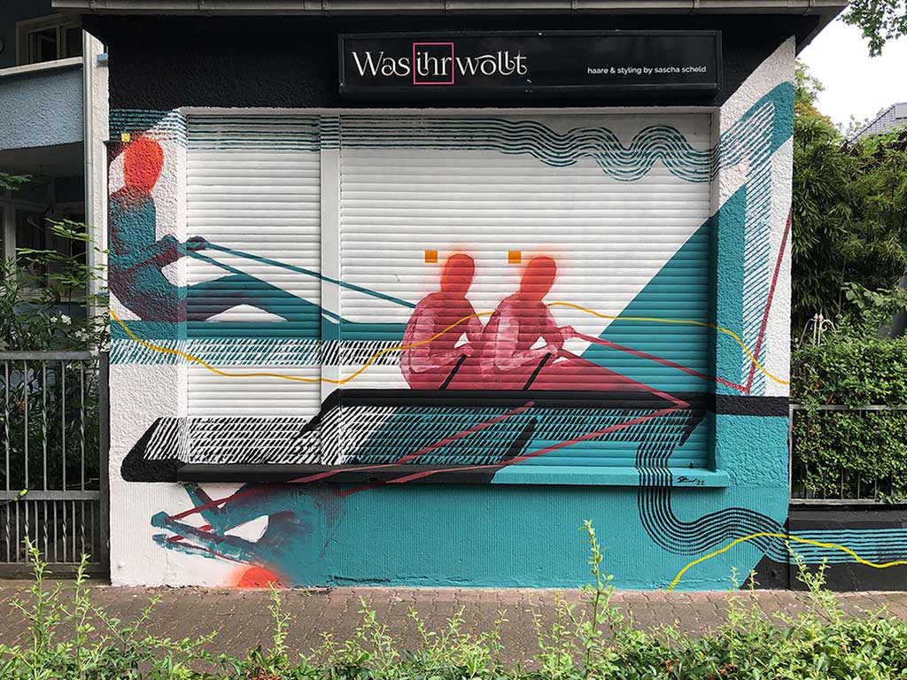Die hier zu sehende Arbeit – halb Mural Art, halb Shutter Art – habe ich Anfang Juli in Frankfurt-Sachsenhausen gesehen. Stilistisch sofort zu erkennen, dass Guido Zimmermann am Werk war, der mit dem gekonnten Einsatz von nur wenigen Farben, einigen Formen und Linien sowie ein paar Ruderer-Motiven das kleine Häuschen von Was ihr wollt bemalt hat.
