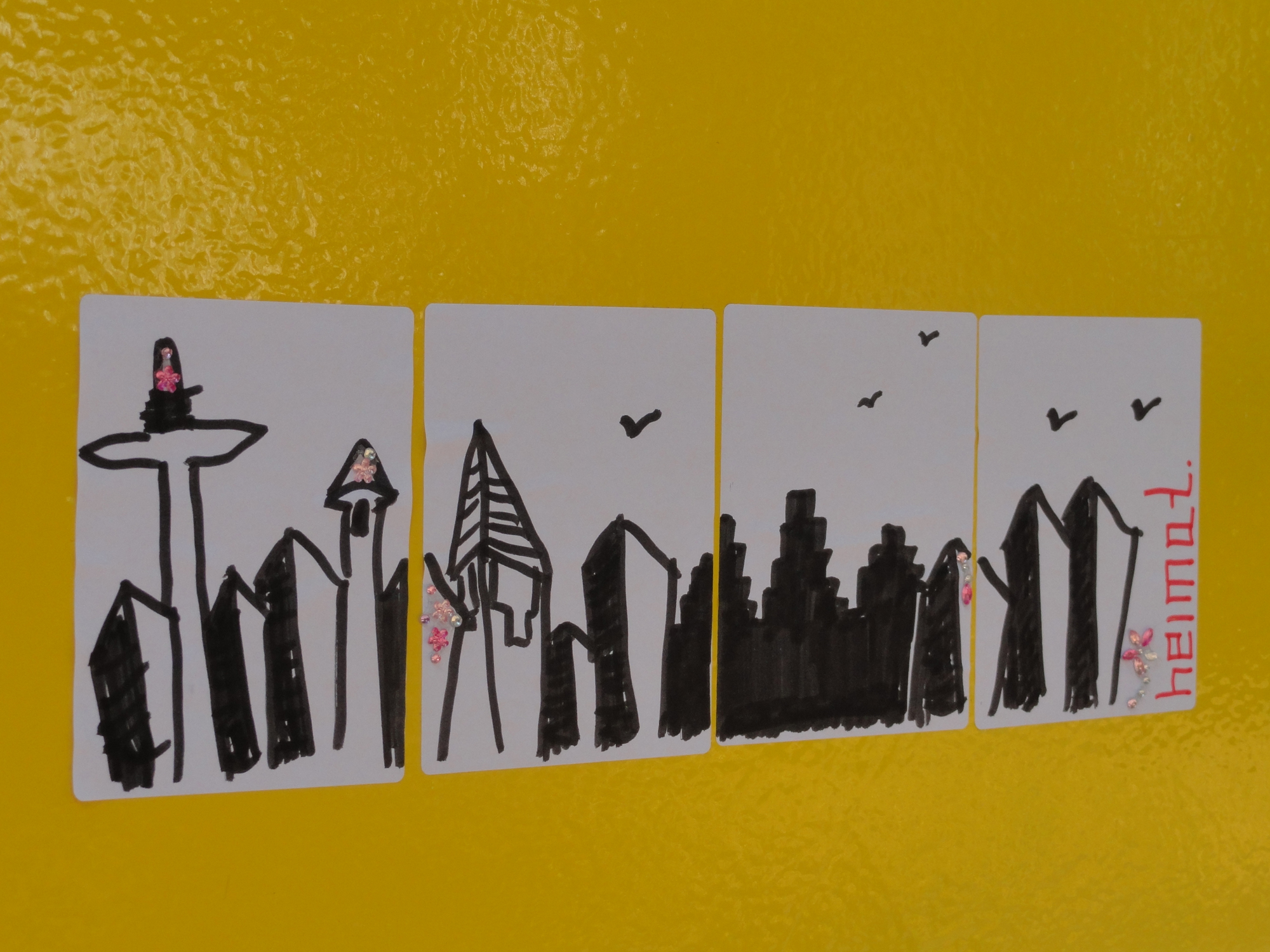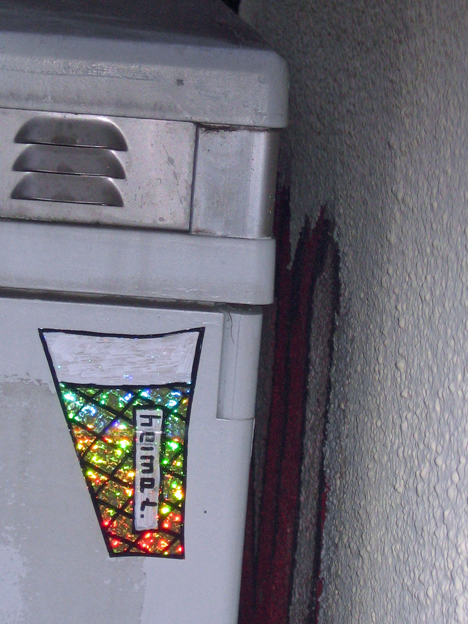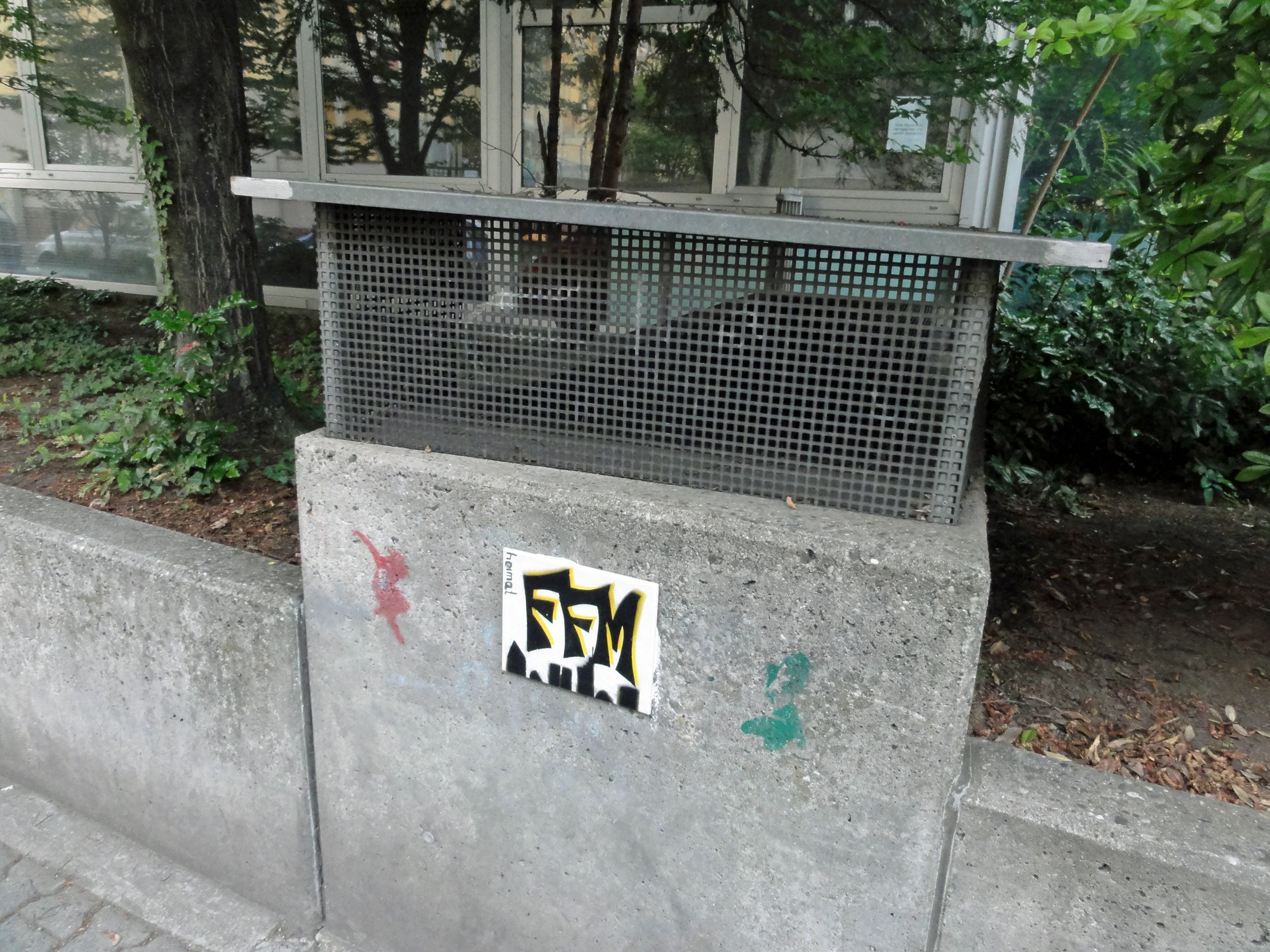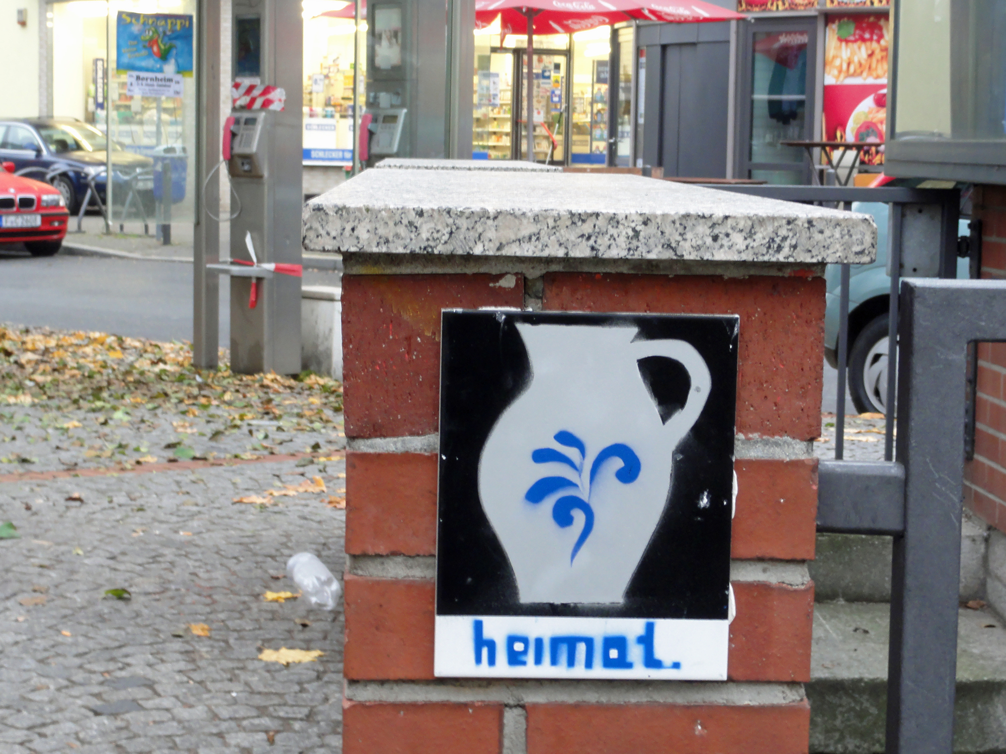 Schablonengraffiti auf Fliesen, kleine, große und reflektierende Aufkleber und Mini-Leinwände tragen heimat.liche Motive wie das Gerippte, den Bembel oder die Skyline auf die Straßen Frankfurts. Die hier zu sehenden Fotos sind in den Stadtteilen Bornheim und Nordend aufgenommen worden.