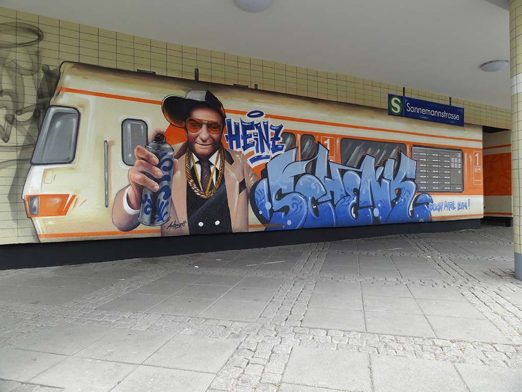 Apfelwein spielt schon lange nicht nur in der Gastronomie eine große Rolle. Man stelle sich einfach ein x-beliebiges Produkt vor und sehr wahrscheinlich wird man jenes, ähnlich wie man es schon aus den Fußballfanshops kennt, erwerben können: Jogginghose mit Bembelmuster, Hundenapf mit Bembelmuster, Mundnasenschutz mit Bembelmuster … Alles kein Problem. Auch in der Urban Art, besonders bei Auftragsarbeiten ist das Thema präsent, z. B. zuletzt in der S-Bahn-Station am Lokalbahnhof in Sachsenhausen. Aktuellster Neuzugang in Frankfurt am Main ist ein Motiv von Artmos4 im Ostend, in dem neben dem gebürtigen Mainzer Heinz Schenk und der Blaue Bock auch die zuvor erwähnten Bembelmuster zum Einsatz kommen, eingearbeitet in den auf die S-Bahn gesprühten Buchstaben und auf der Sprühdose.