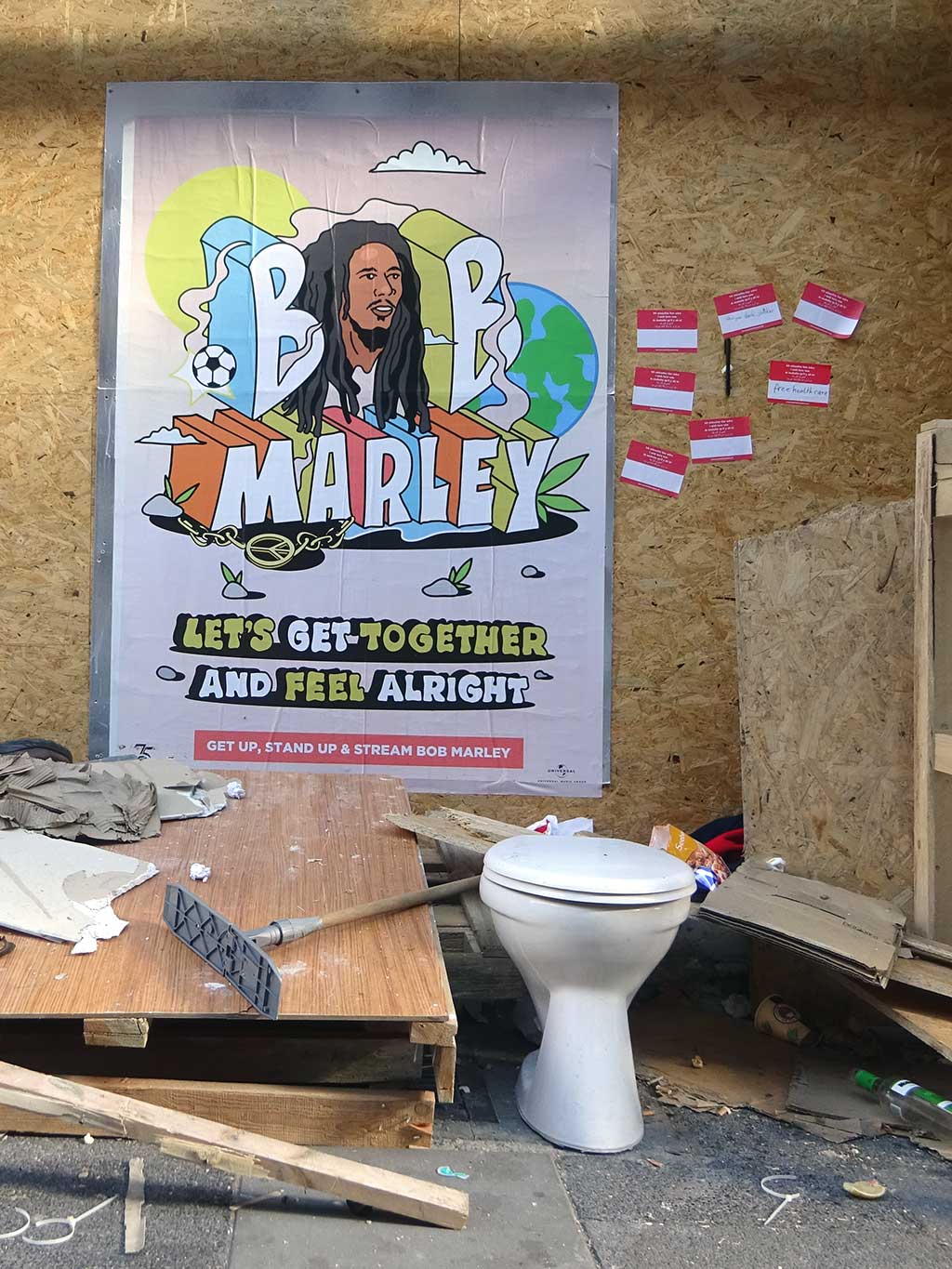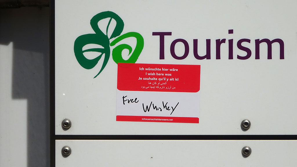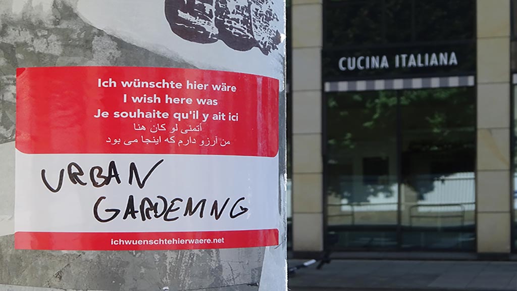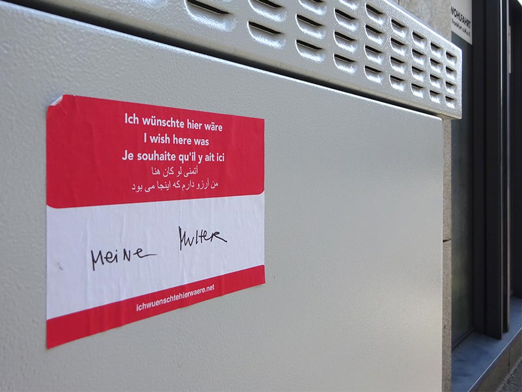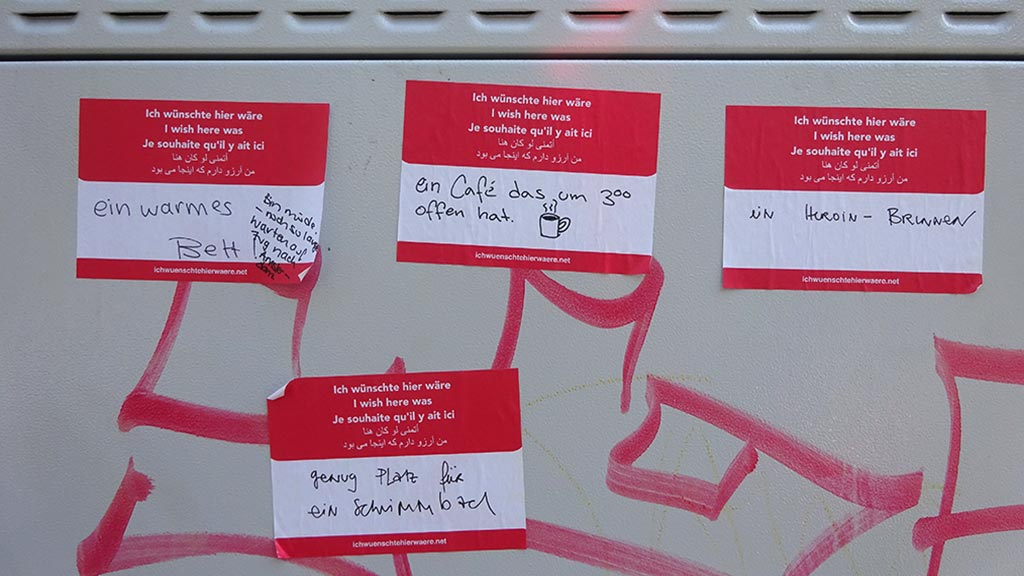 Rund um das Frankfurter Bahnhofsviertel lassen sich derzeit Aufkleber entdecken, die inhaltlich an die bunten „Hier müsste“-Texte und in ihrer Machart an die „Hello my name is“-Aufkleber erinnen. Die „Ich wünschte hier wäre“-Aufkleber verfügegen ebenfalls über eine Freifläche zur persönlichen Beschriftung, nur dass in diesem Fall – mehrsprachig – dazu aufgefordert wird, einen Wunsch zu äußern, und zwar vorzugsweise einen, der Bezug nimmt auf die Stelle, an dem dieser klebt.