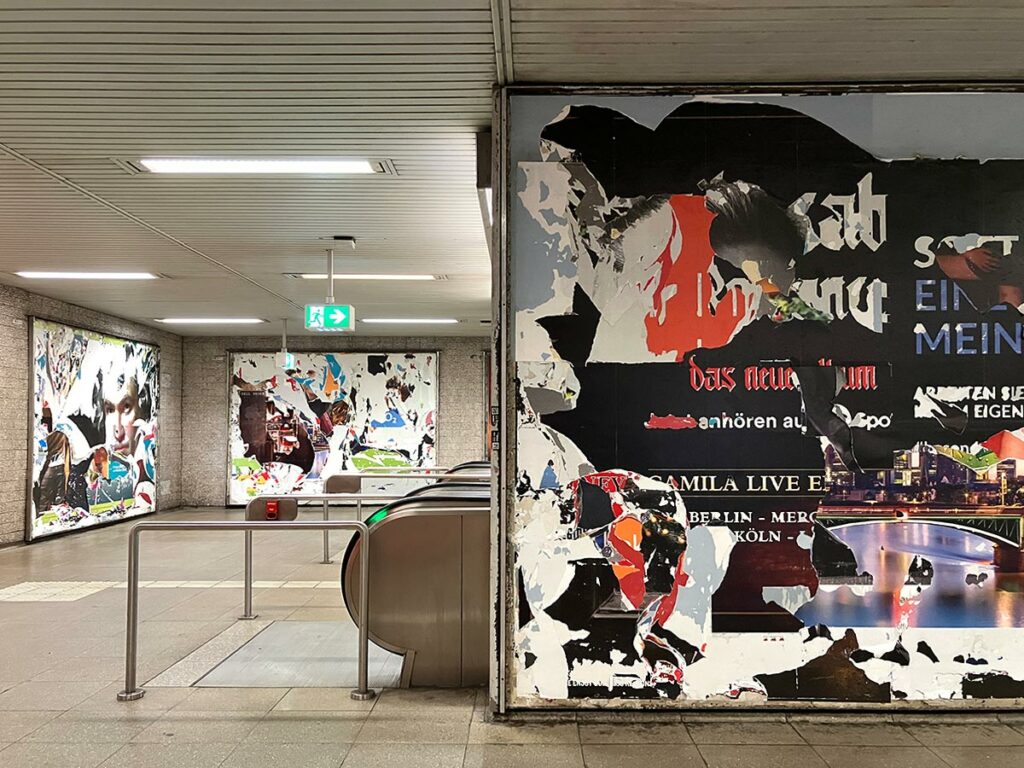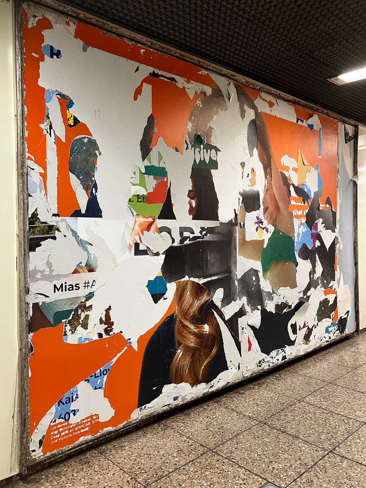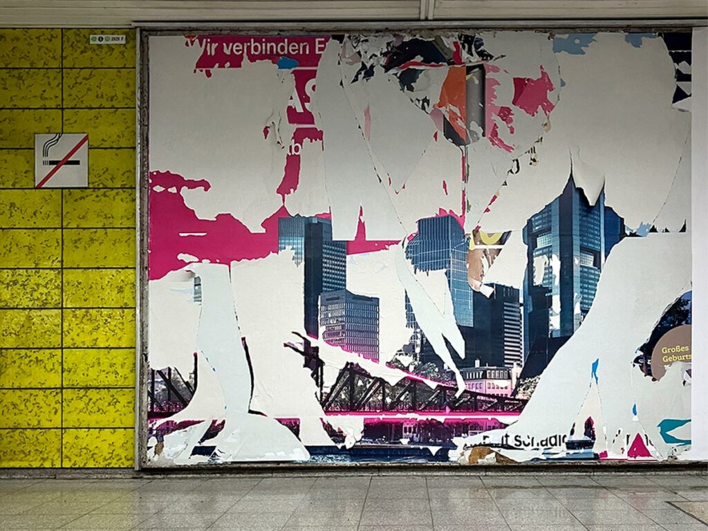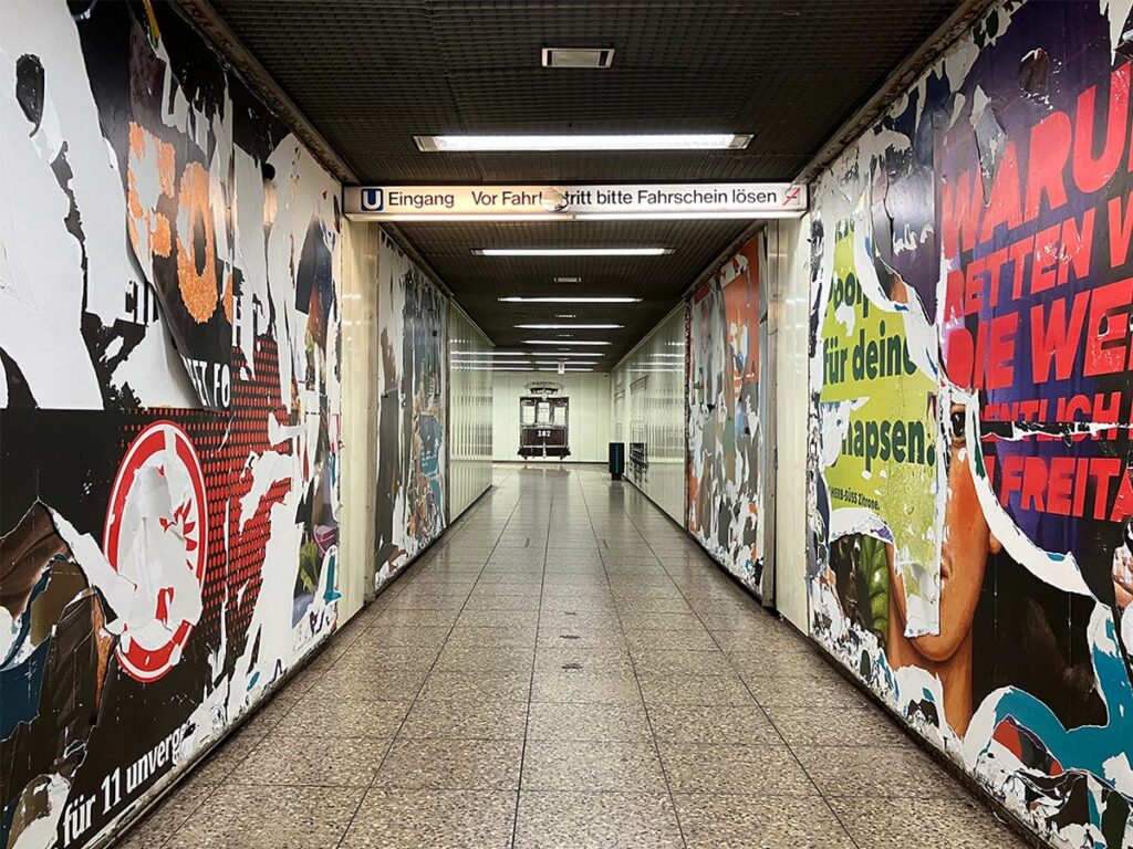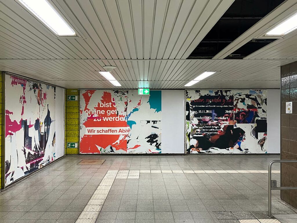Zu sehen waren die auf den Fotos gezeigten Plakatabrisse in den ersten zwei Wochen des neuen Jahres, und zwar in den B-, C- und D-Ebenen der Haltestellen Bornheim Mitte, Hauptwache und Willy-Brandt-Platz.